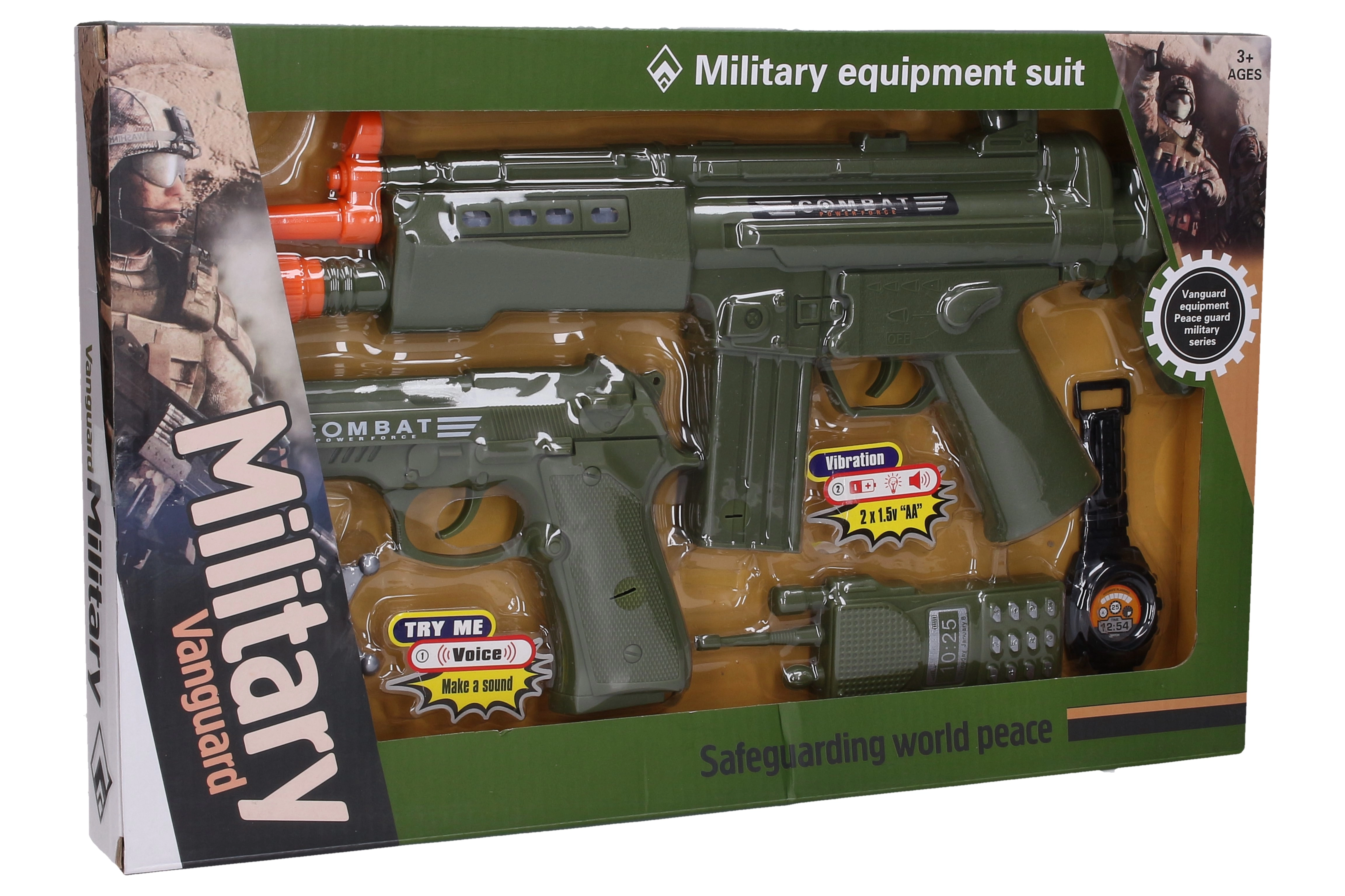 Pilns militārais komplekts mazajiem piedzīvojumu meklētājiem ietver automātu, pistoli, nozīmīti, rāciju un pulksteni. Rotaļlieta rada gaismas un skaņas efektus, kas pastiprina spēles pieredzi. Automāts darbojas ar 2× AA baterijām (iekļautas komplektā), tāpēc bērni var sākt spēlēt uzreiz.