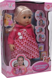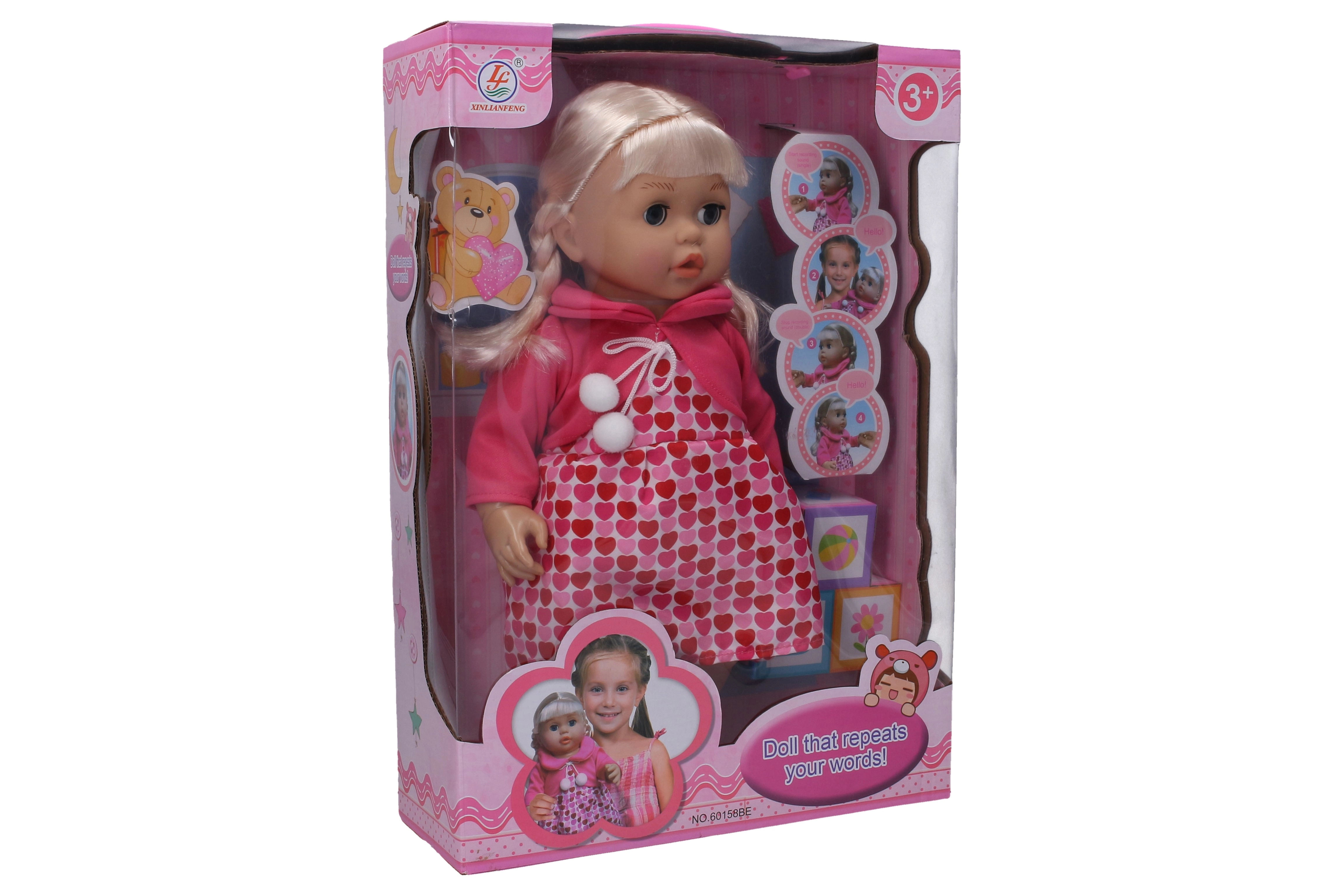Izklaides lelle, kas atkārto to, ko sakāt! Nospiežot labo roku, sākas ierakstīšana, bet nospiežot kreiso roku, lelle atskaņo jūsu ziņu. Izmērs 40 cm. Interaktīva rotaļlieta runas prasmju attīstībai un izklaidei. Viegla vadība ar pogām rokās. Baterijas 2× AA nav iekļautas.