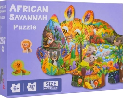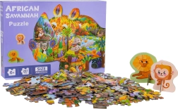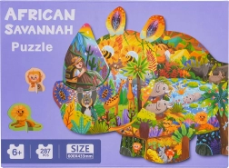 Šis radošais safari dzīvnieku puzļu komplekts sniedz bērniem no 6 gadiem stundām ilgu izklaidi un mācīšanos. Pēc salikšanas izveidosiet lielu degunradža formas attēlu ar safari dzīvnieku ilustrācijām. Divus speciālos gabaliņus ar statīviem (lauva un pērtiķītis) var novietot, piemēram, uz plaukta vai galda.
