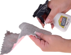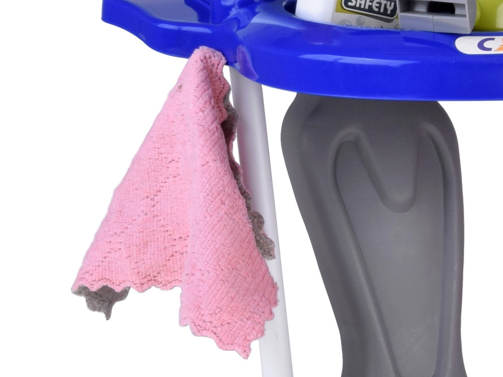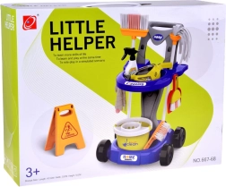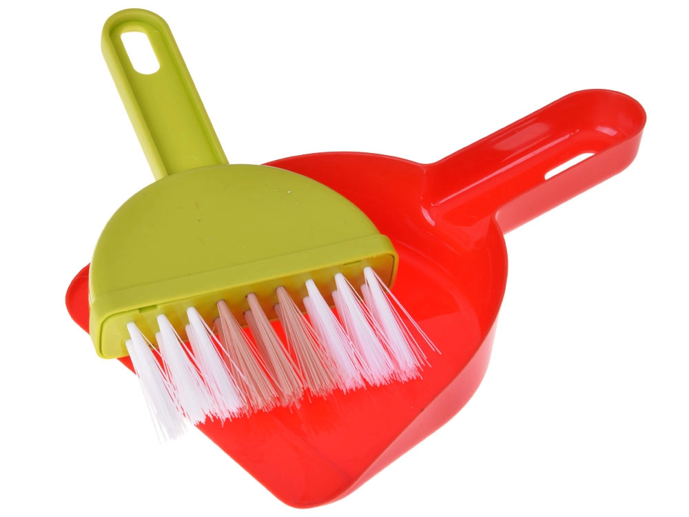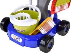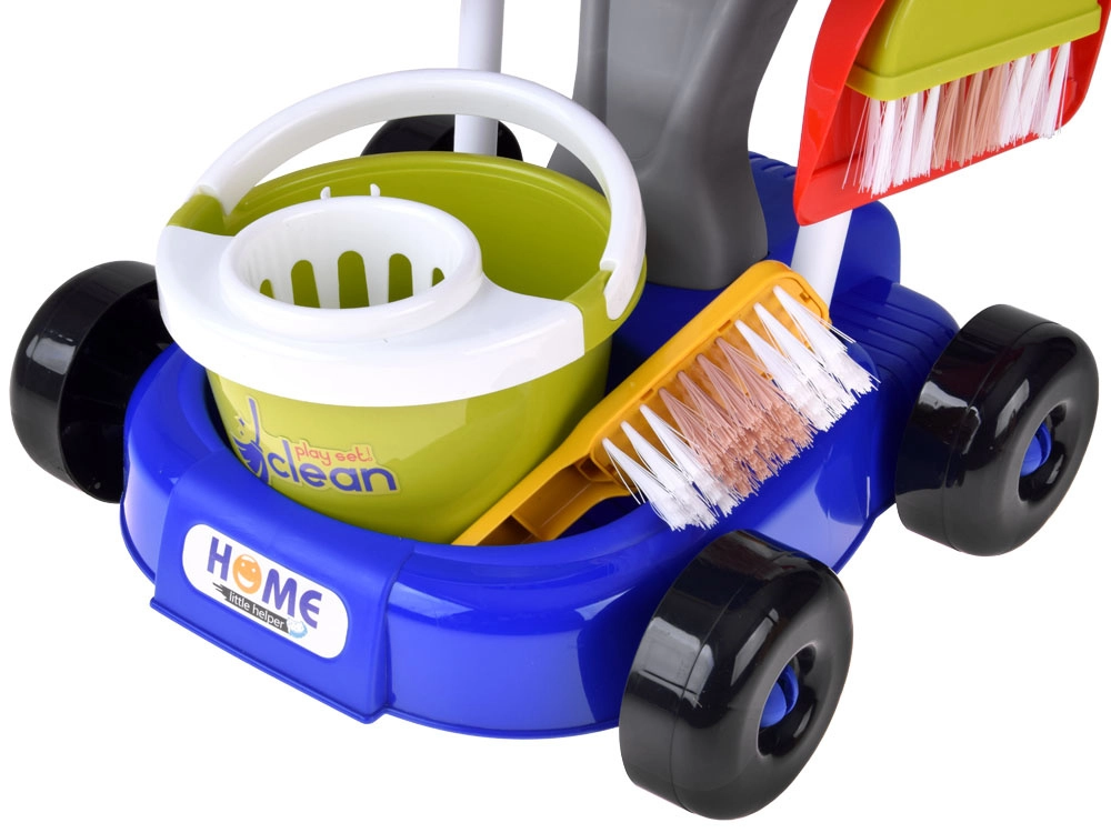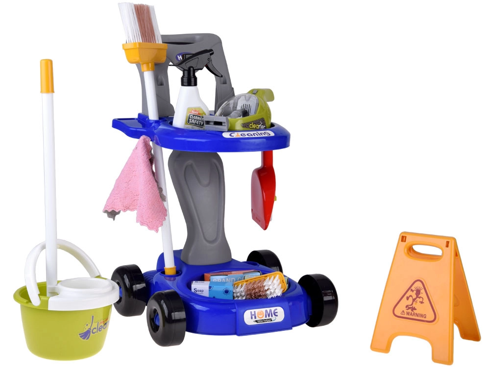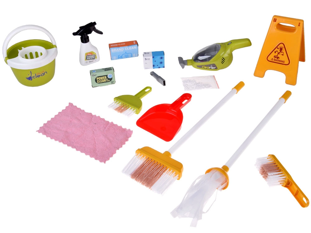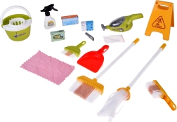 Mops, slotas kāts ar slotu, birstīte un lāpstiņa, spainis ar izgriezēju, lupatiņa, smidzinātājs, brīdinājuma zīme un kastītes – viss, kas bērniem vajadzīgs, lai atdarinātu mājas darbus.