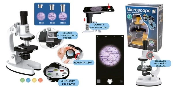 Atklājiet aizraujošo pasauli ap mums ar šo kvalitatīvo bērnu mikroskopu. Tas piedāvā 3 palielinājuma līmeņus 200×/600×/1200×, 4 krāsu filtrus labākam kontrastam un tālruņa turētāju ērtai paraugu fotografēšanai. Ideāla dāvana mazajiem pētniekiem un topošajiem zinātniekiem.