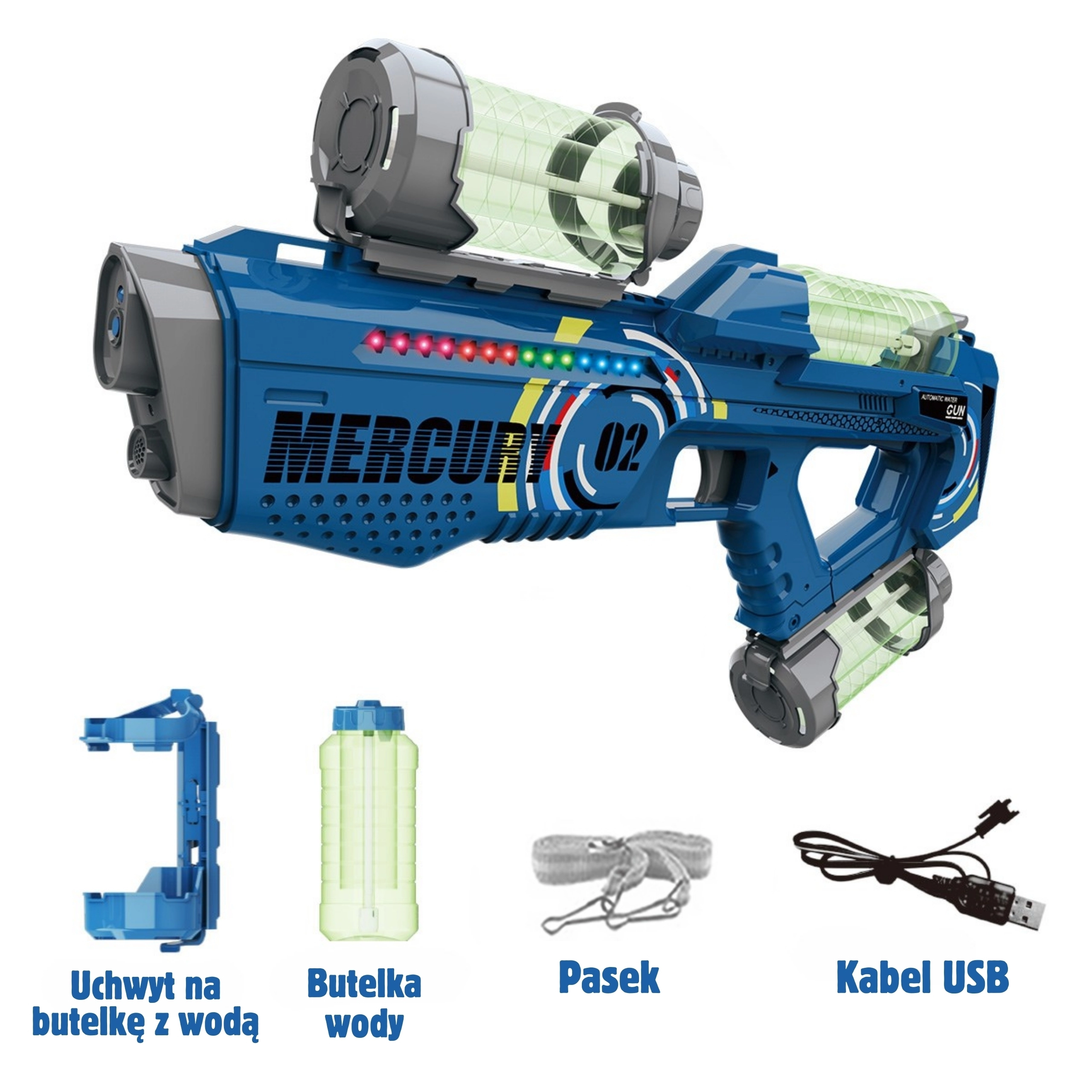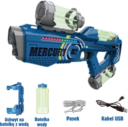 - ūdens pistole MERCURY 02, 3 rezervuāri, USB kabelis, pleca siksna, instrukcija