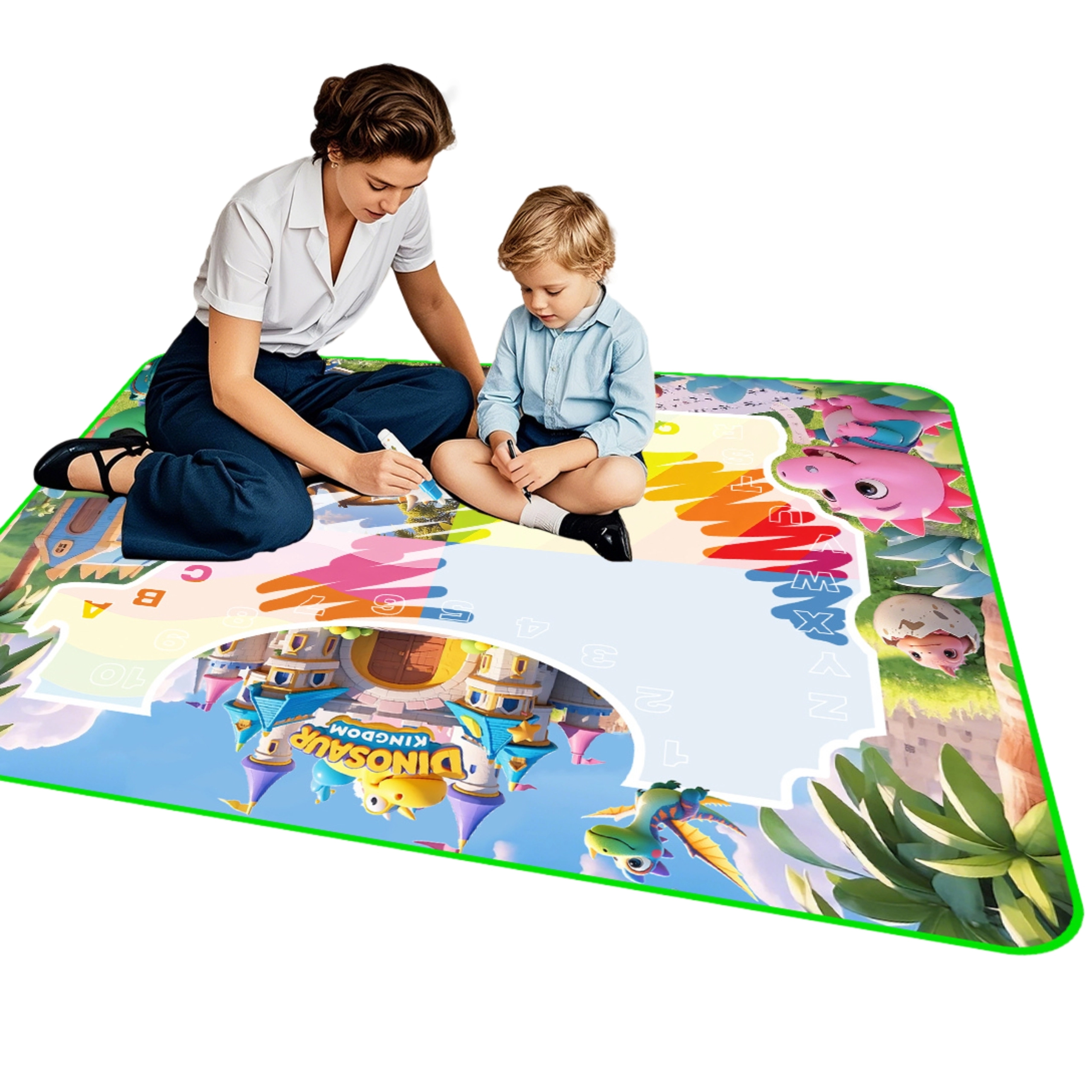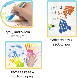 Iepakojumā ietilpst ūdens flomasteri, putu zīmogdati un ideju grāmatiņa, kas iedvesmos jaunus attēlus un rakstus. Pateicoties lielākam izmēram, paklājiņš ir ideāli piemērots arī kopīgai darbošanai brāļiem un māsām vai vecākiem ar bērniem.