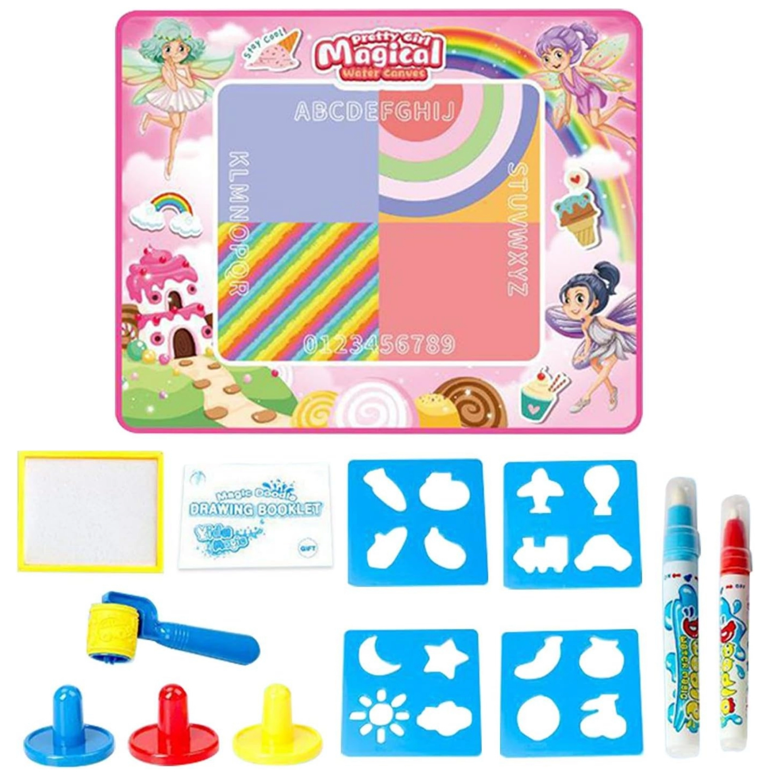 - 1× liels ūdens paklājs, 6× ūdens flomāsteris, 1× rullītis, 3× zīmogs ar turētāju, 1× spilventiņš nospiedumiem, 4× šablons, 1× zīmēšanas brošūra