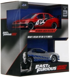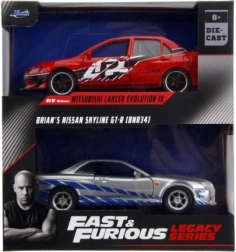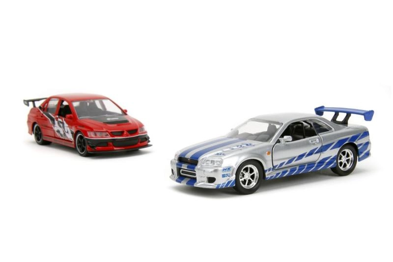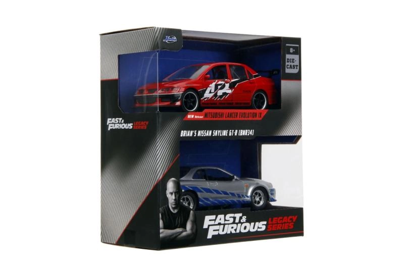 Iegūsti uzreiz Mitsubishi Lancer Evo IX 2006 un Briana Nissan Skyline GT‑R R34 – ikonisku duetu no Ātrs un bez žēlastības 1:32 mērogā.