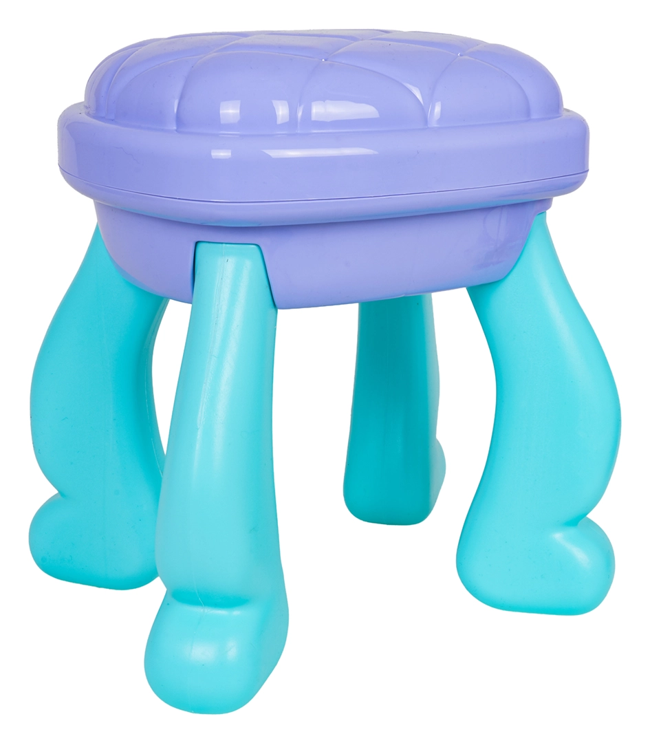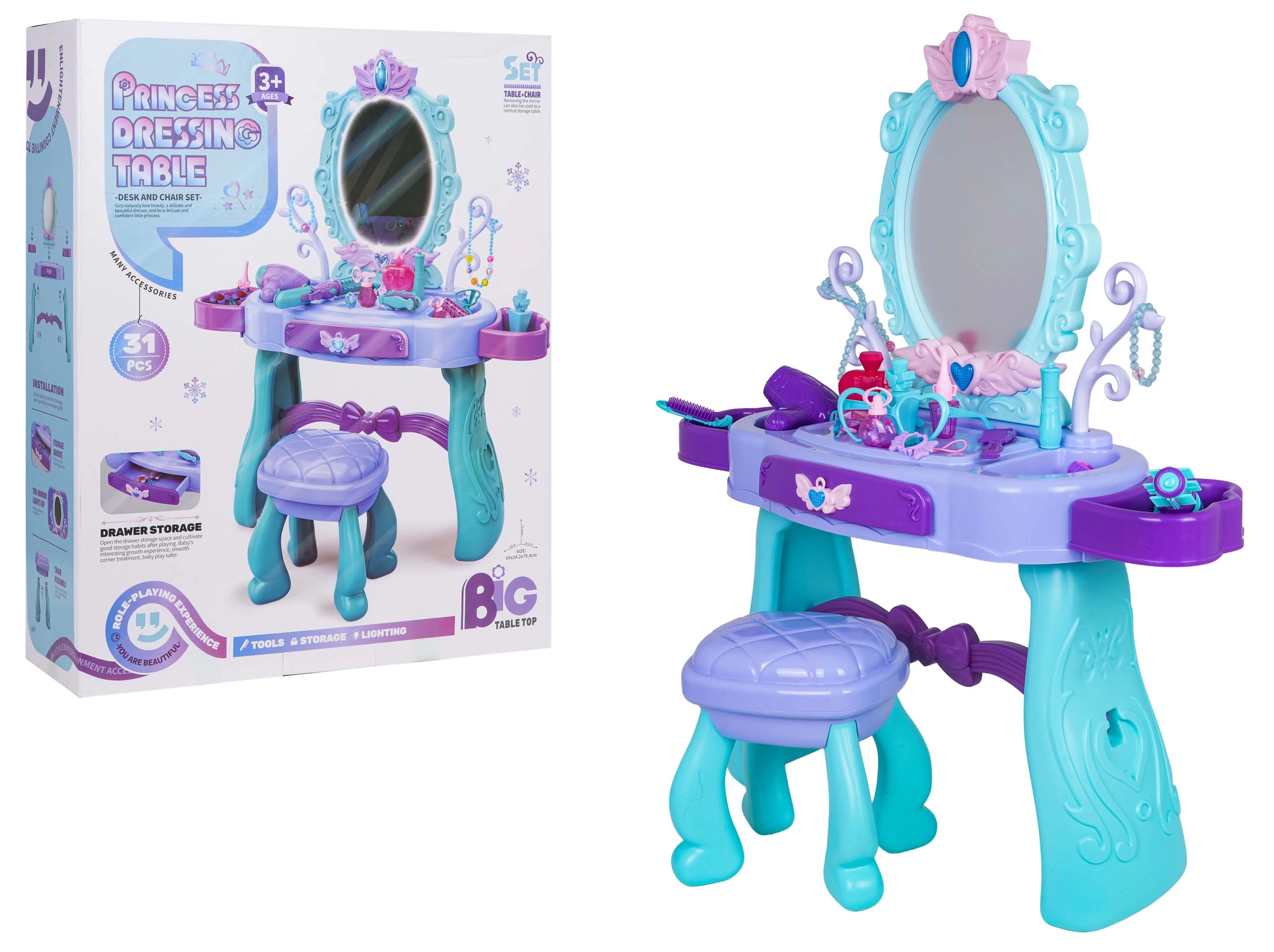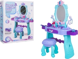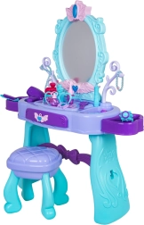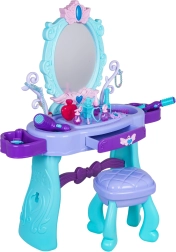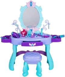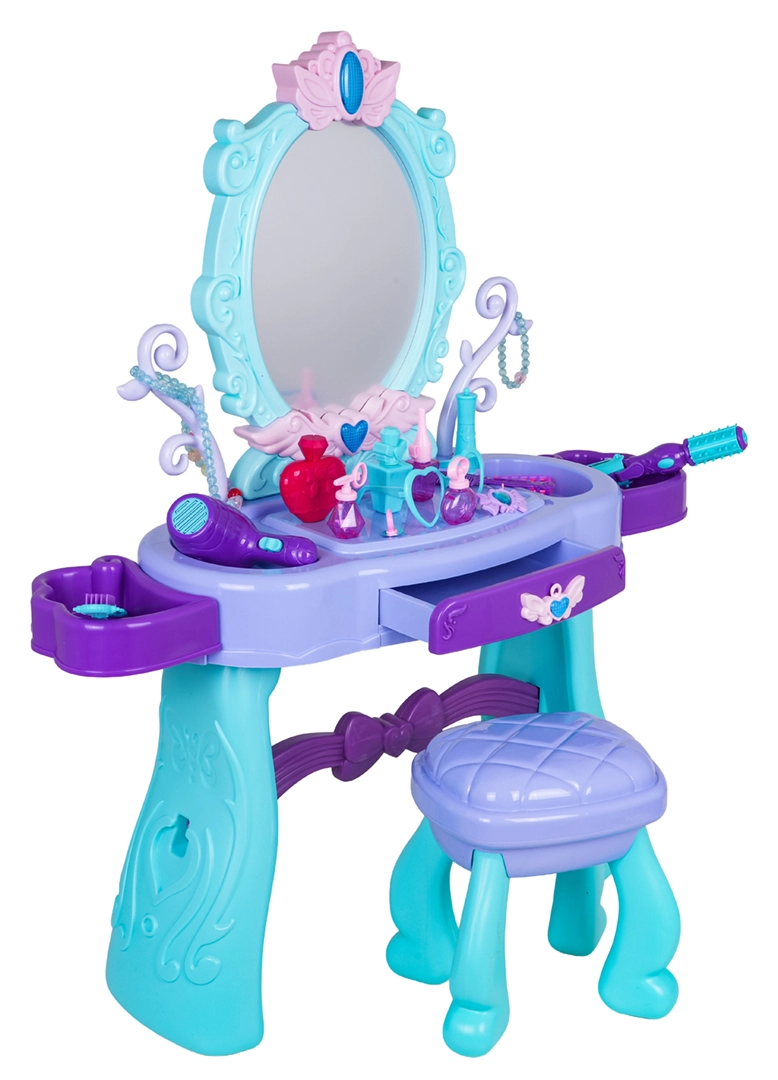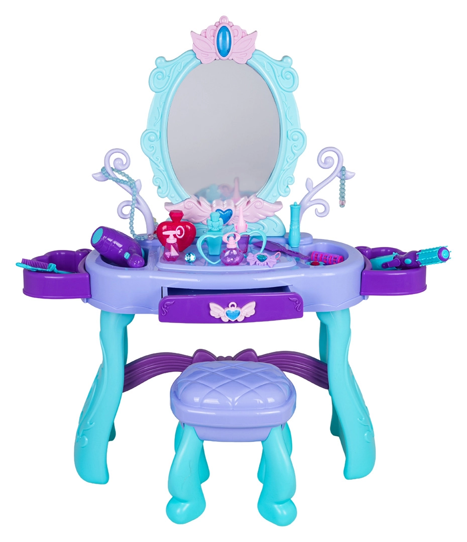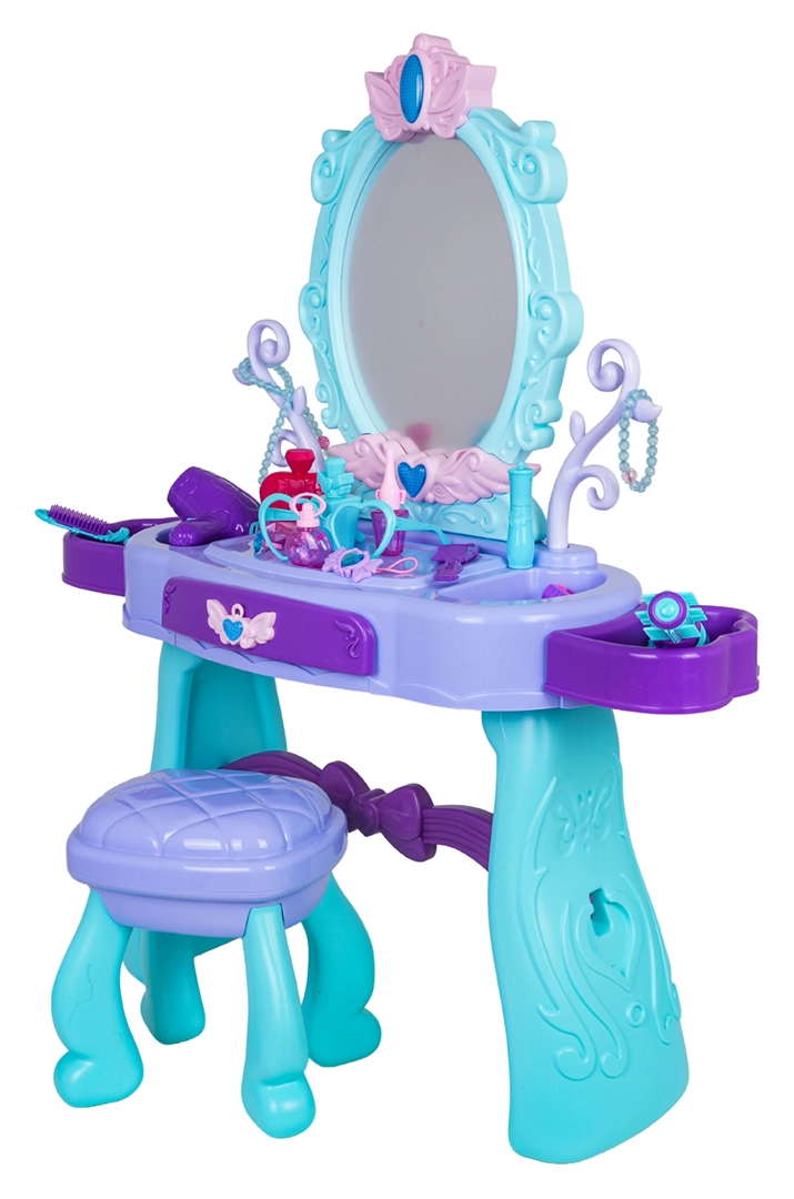 Uzdāviniet bērniem viņu pašu burvīgu skaistumkopšanas stūrīti. Šis tualetes galdiņš tirkīza un violetu toņu kombinācijā piedāvā lielu ovālu spoguli ar apgaismojumu, praktisku atvilktni un sānu novietošanas virsmas visiem piederumiem. Stabils krēsliņš nodrošina ērtu sēdēšanu un drošu spēli.