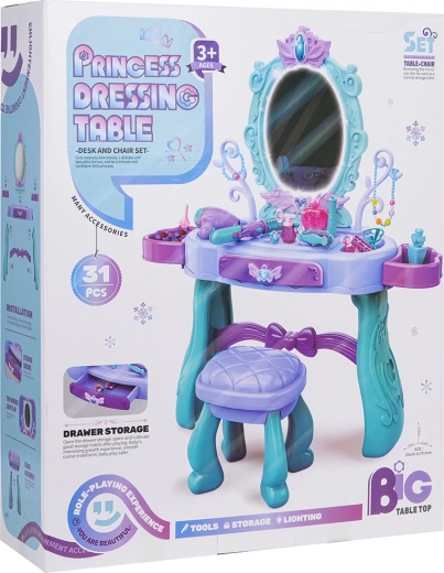 Stilīgs bērnu tualetes galdiņš ar lielu spoguli, apgaismojumu un bagātīgu aksesuāru komplektu radošai spēlei. Ietver krēsliņu, atvilktni un sānu plauktiņus piederumiem. Iepakojumā atradīsiet fēnu, lokšķēres ar taisnotāju, ķemmes, brilles, rotas un grima piederumus. Spoguļa gaismai nepieciešamas 2× AA baterijas (nav iekļautas). Ideāla dāvana mazām princesēm no 3 gadu vecuma.