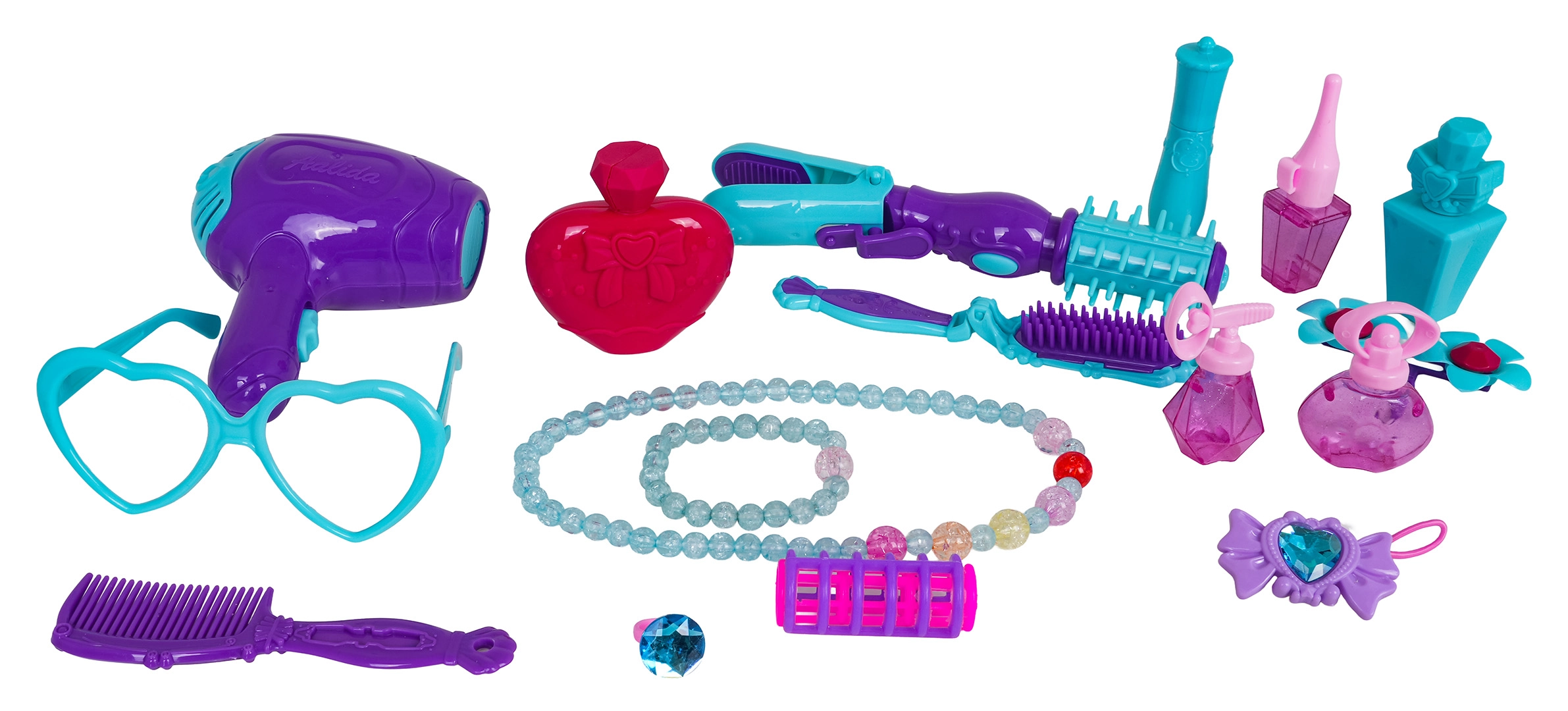 - Tualetes galdiņš, krēsliņš, fēns, lokšķēres ar taisnotāju, saliekama matu suka, ķemme, brilles, krelles, aproce, gredzens, sprādzes, matu gumija, flakoniņi, lūpu krāsas un nagu lakas atrapas, rullīši, 3× trauciņš “kosmētikai”
