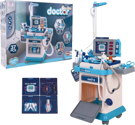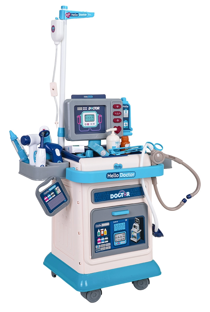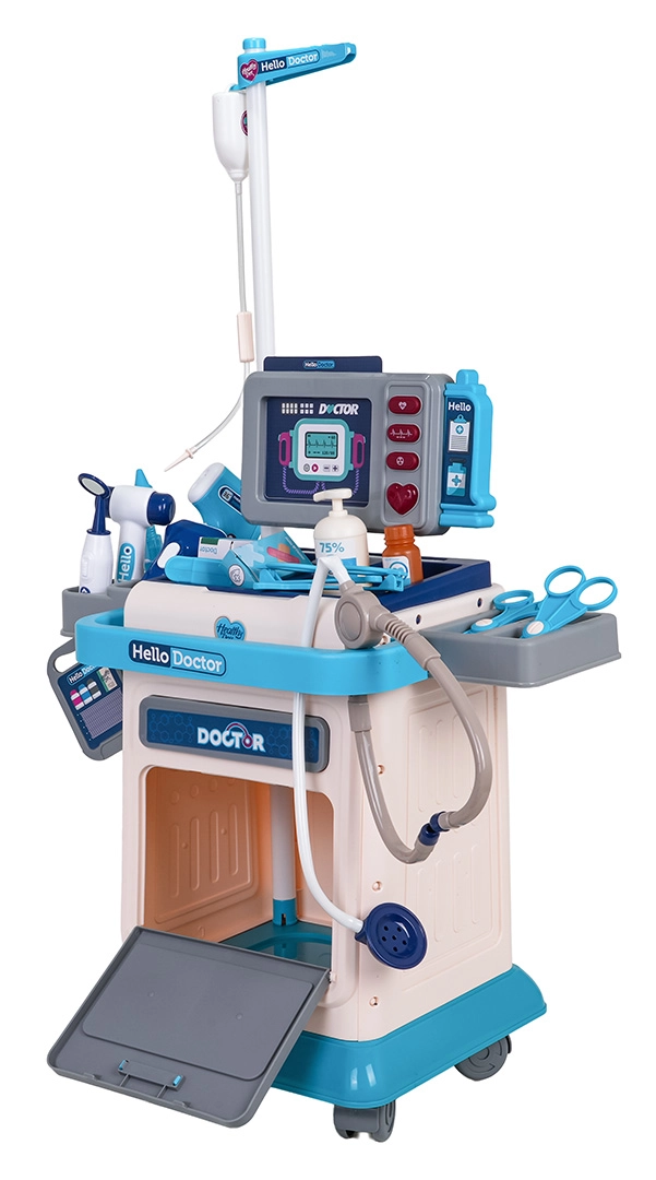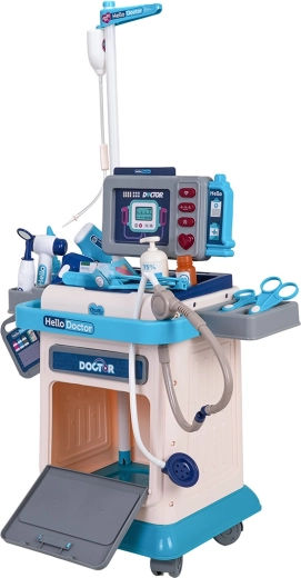 Bērni atradīs komplektā visu nepieciešamo: stetoskopu, bezkontakta termometru ar gaismu, šļirci, šķēres, pinceti, spogulīti, neiroloģisko āmuriņu, brilles, kā arī sīkus piederumus, piemēram, pacienta karti, pudelīti ar “dezinfekciju”, kastīti ar plāksteriem un zālēm vai IV statīvu. Ratiem ir praktiska atvilktne un turētāji ērtai instrumentu kārtošanai.
