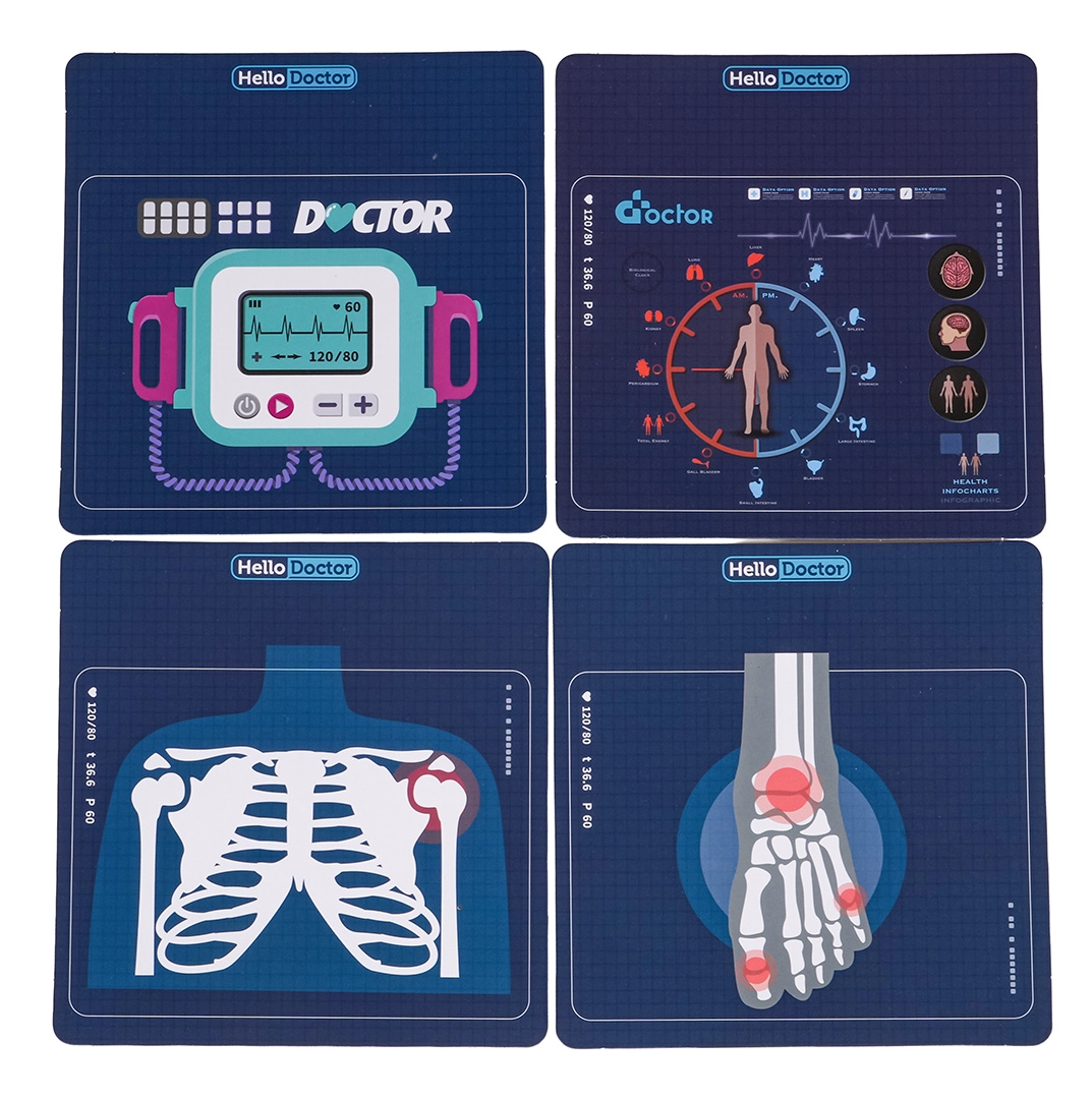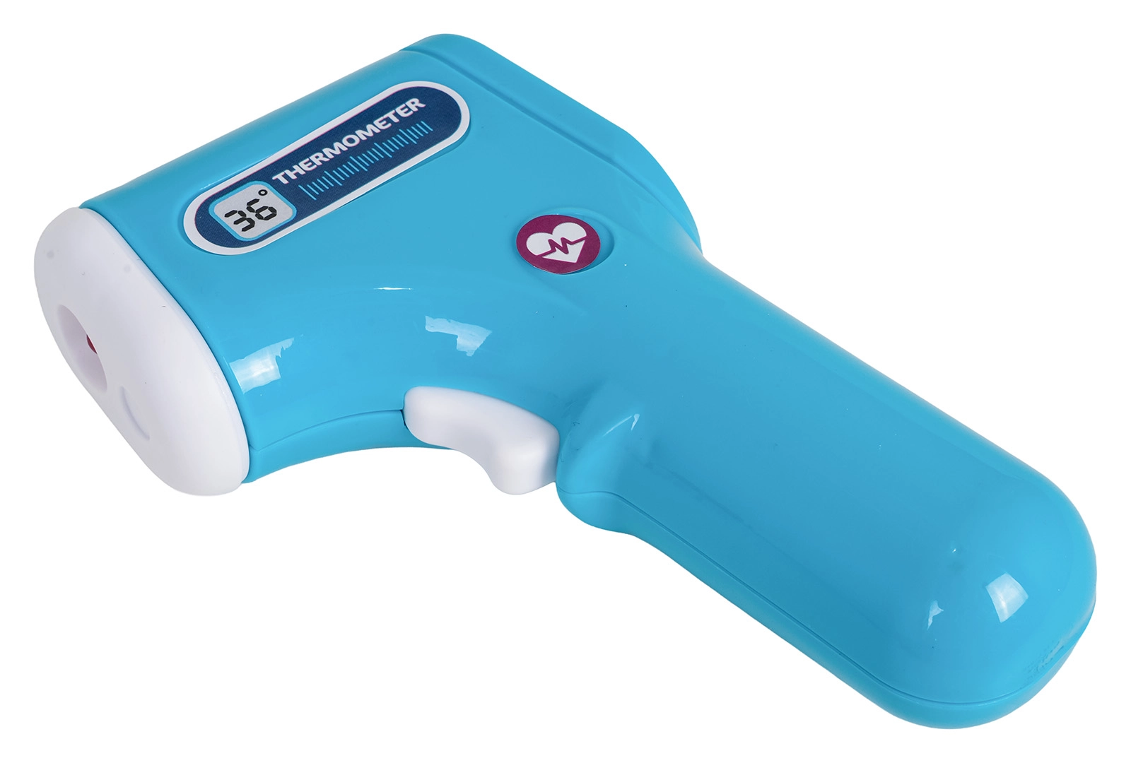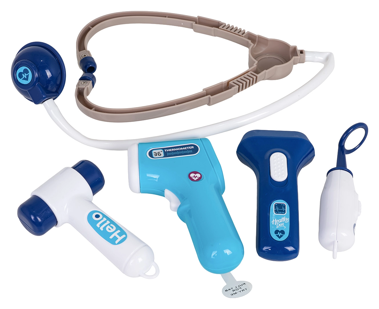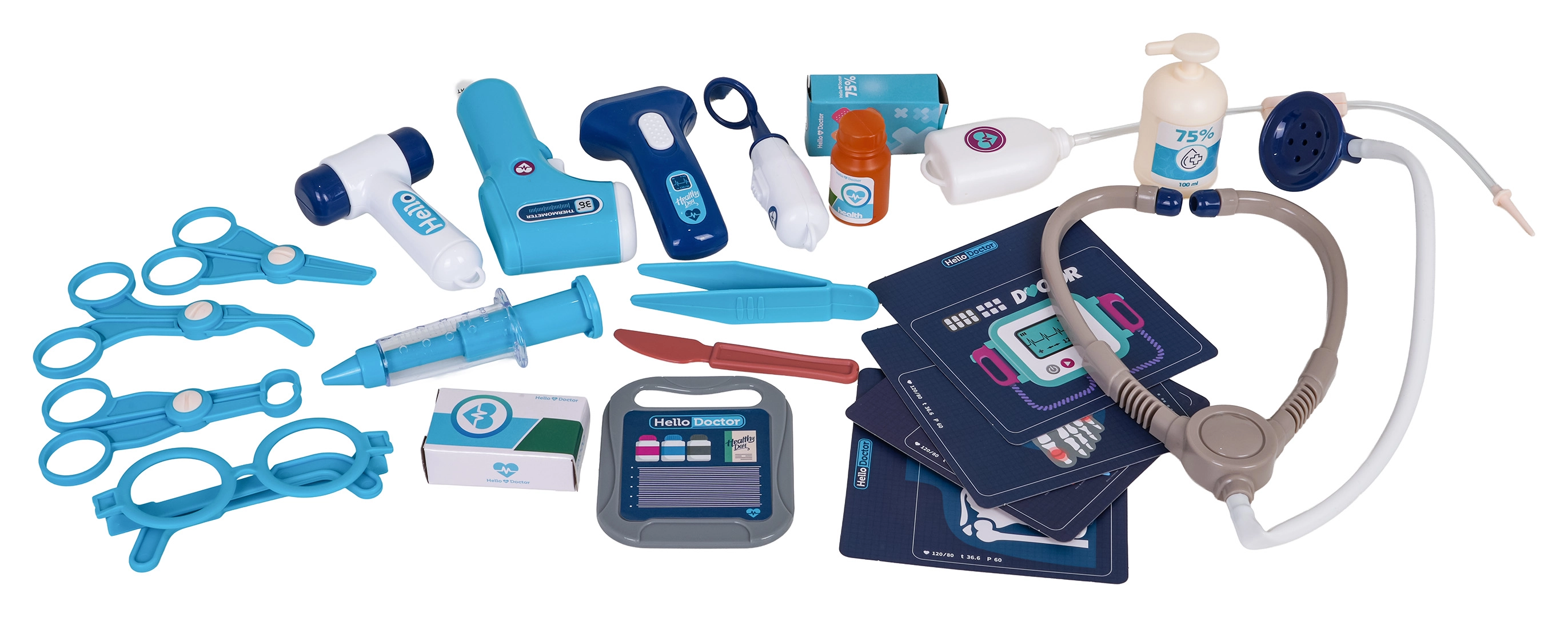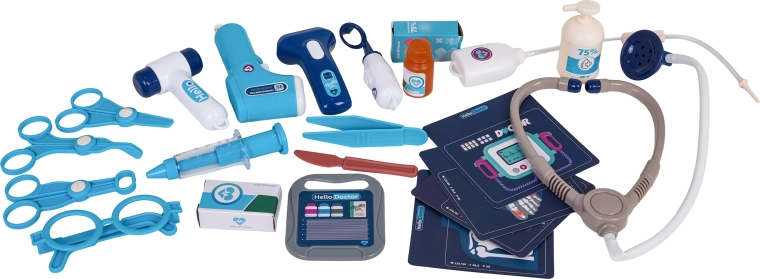 Stetoskops, bezkontakta termometrs ar gaismu, šļirce, šķēres, pincete, spogulītis, āmuriņš, brilles, pacienta karte un citi piederumi radošai spēlei.