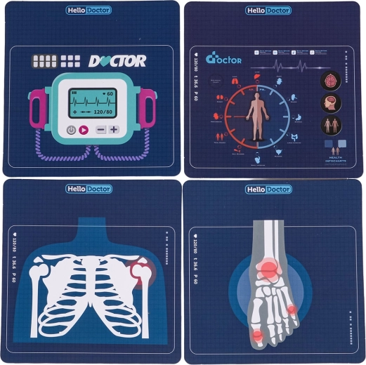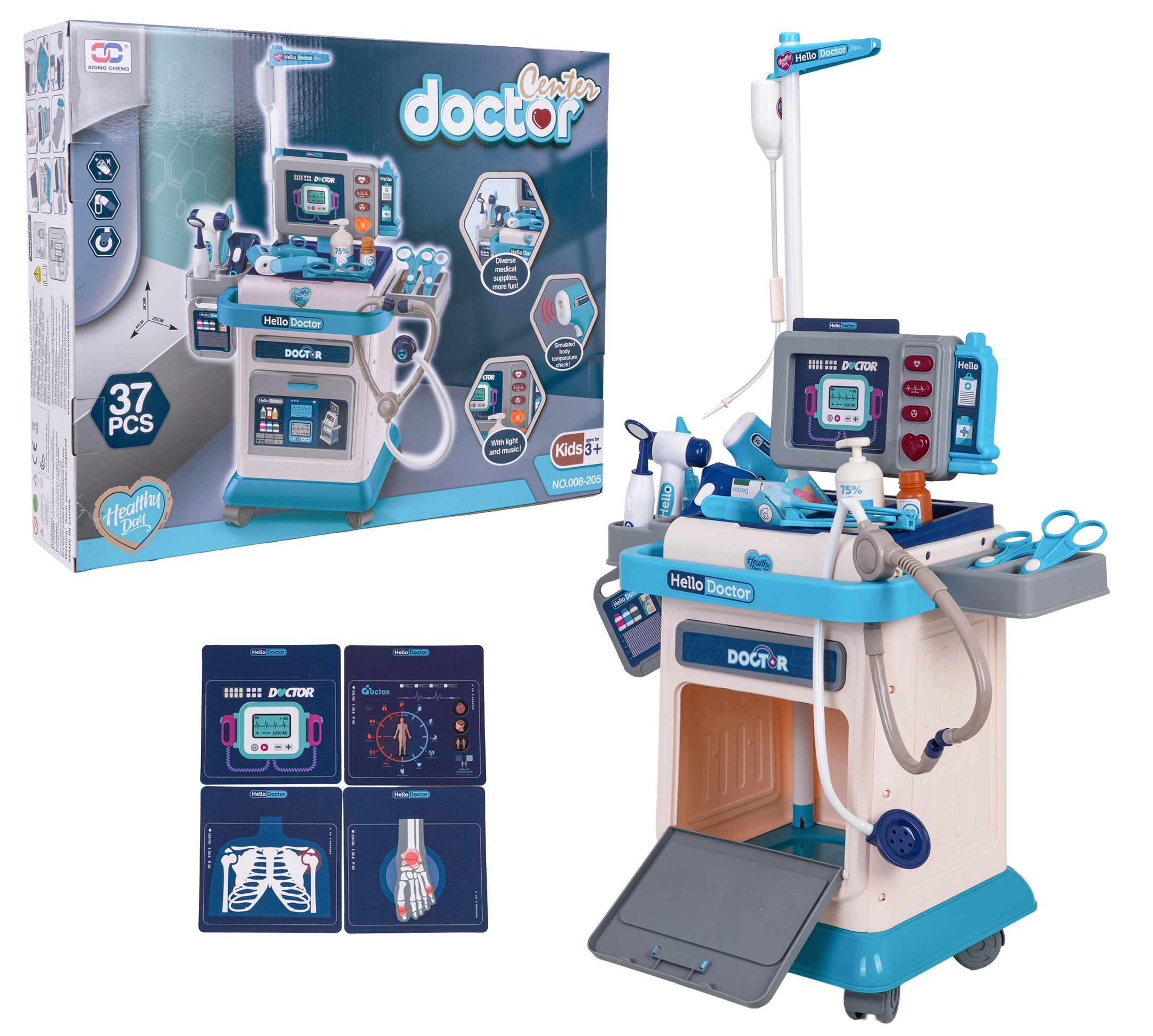 Šis bagātīgi aprīkotais bērnu ārsta komplekts piedāvā aizraujošu un izglītojošu ārsta lomspēli. Stabilie rati uz riteņiem ar regulējamu rokturi atvieglo “kabinetu” pārvietošanu, kamēr monitora panelis nodrošina gaismas un skaņas efektus – sirds puksti, temperatūras mērīšana, tomogrāfa skaņa un trauksme. Komplektā ir nomaināmi attēli EKG un tomogrāfam, kas pastiprina reālistiskumu.