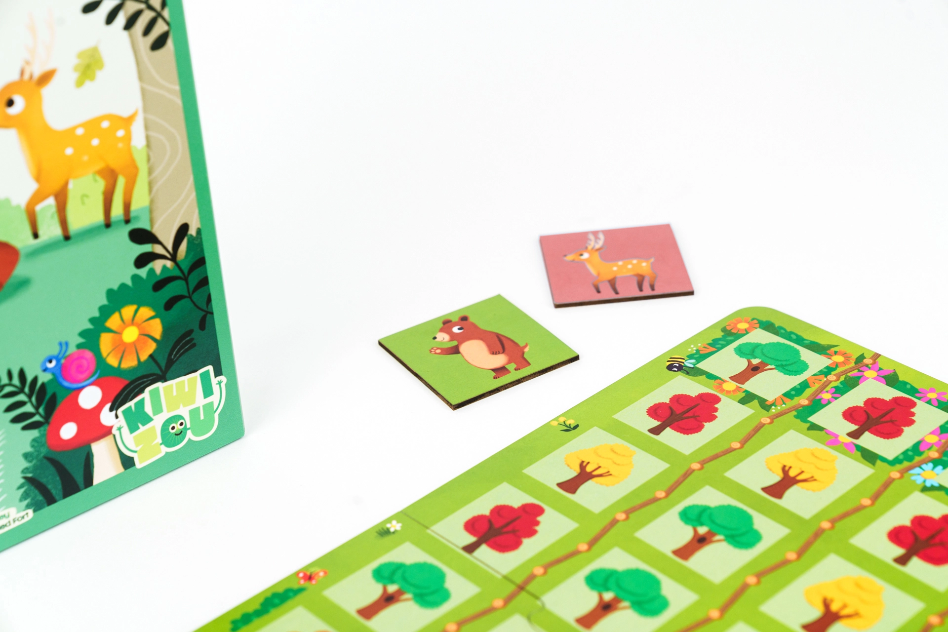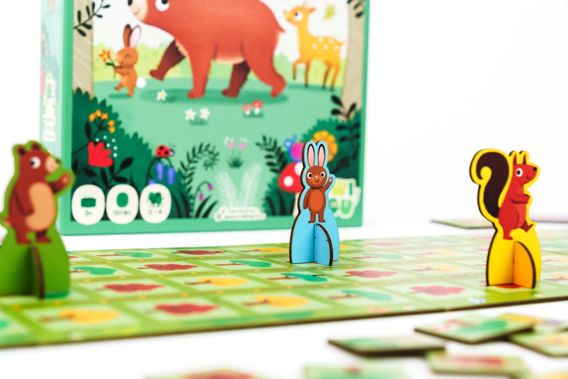 Iepakojumā: liels meža spēles plāns (4 daļas), 4 kartona totema dzīvnieku figūriņas, 4 personāžu kartes, 30 žetoni, 12 ēdiena žetoni, kokvilnas vilkšanas maisiņš.
