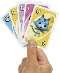Speciālie piktogrammi uz kārtīm atvieglo krāsu atšķiršanu un padara spēli pārskatāmu arī pašiem mazākajiem. Neiztrūkst arī darbības kārtis, piemēram, Izlaišana, Virziena maiņa vai Paņem karti, kas partijai piešķir spriedzi un pārsteigumus. Un, kad jums paliek pēdējā kārts, neaizmirstiet iesaukties UNO!