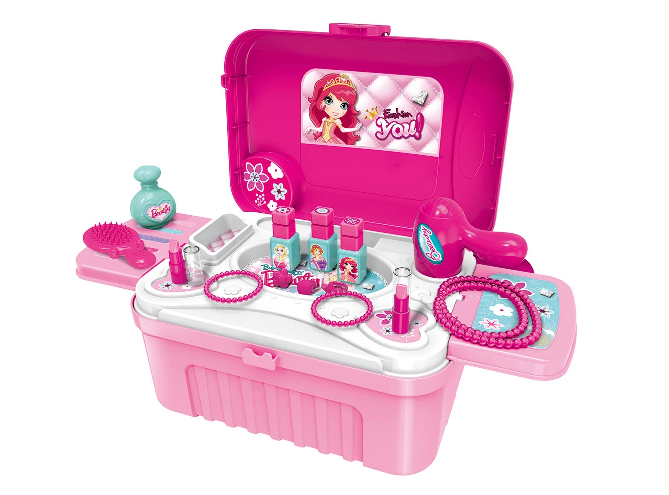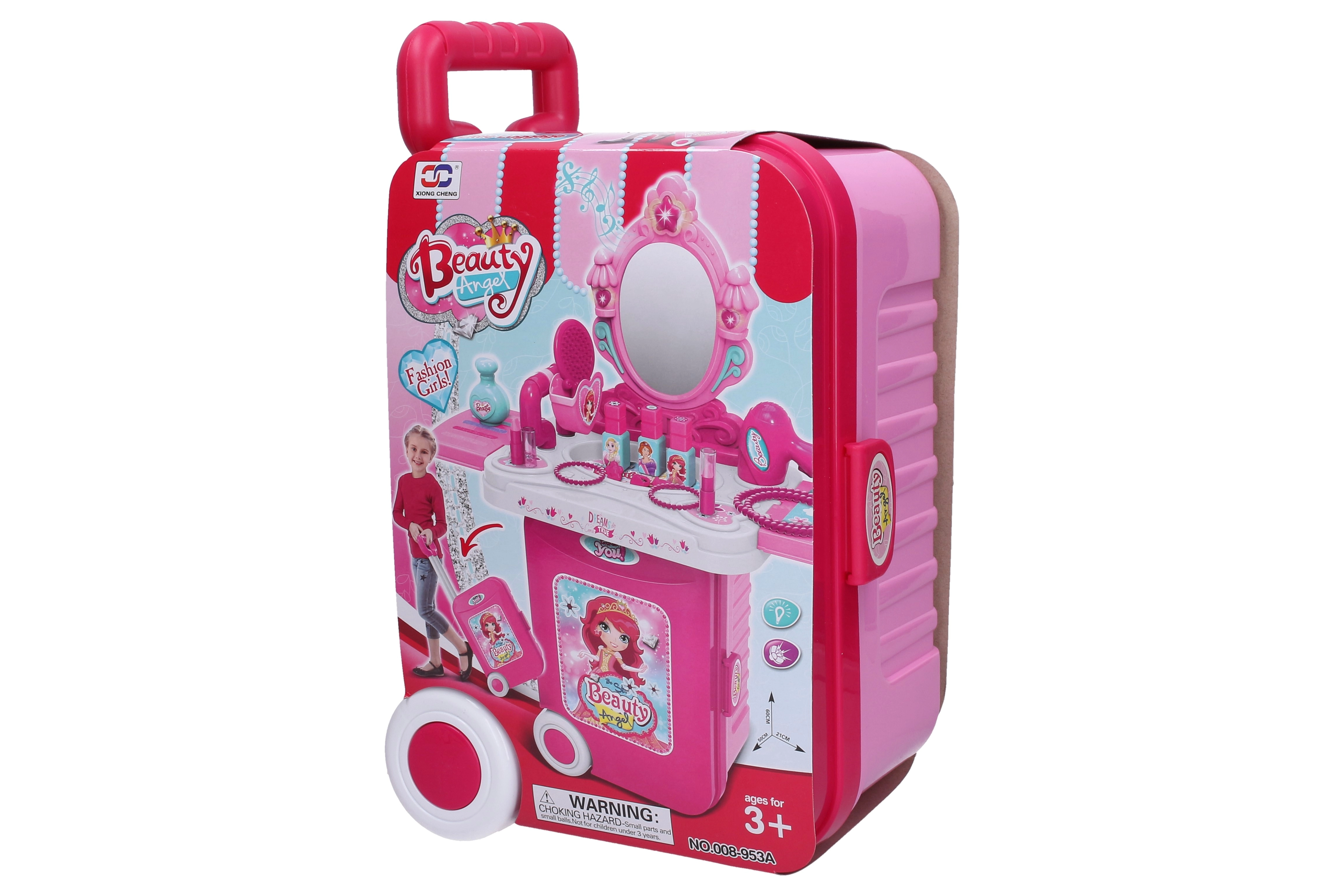 Pārvērt stilista rotaļas neaizmirstamā piedzīvojumā ar šo bērnu kosmētikas koferīti uz riteņiem, ko viegli pārbūvēt par kosmētikas galdiņu. Tas piedāvā gaismas un skaņas efektus, izvelkamu rokturi ērtai pārvietošanai un bagātīgu piederumu komplektu radošai lomu spēlei.