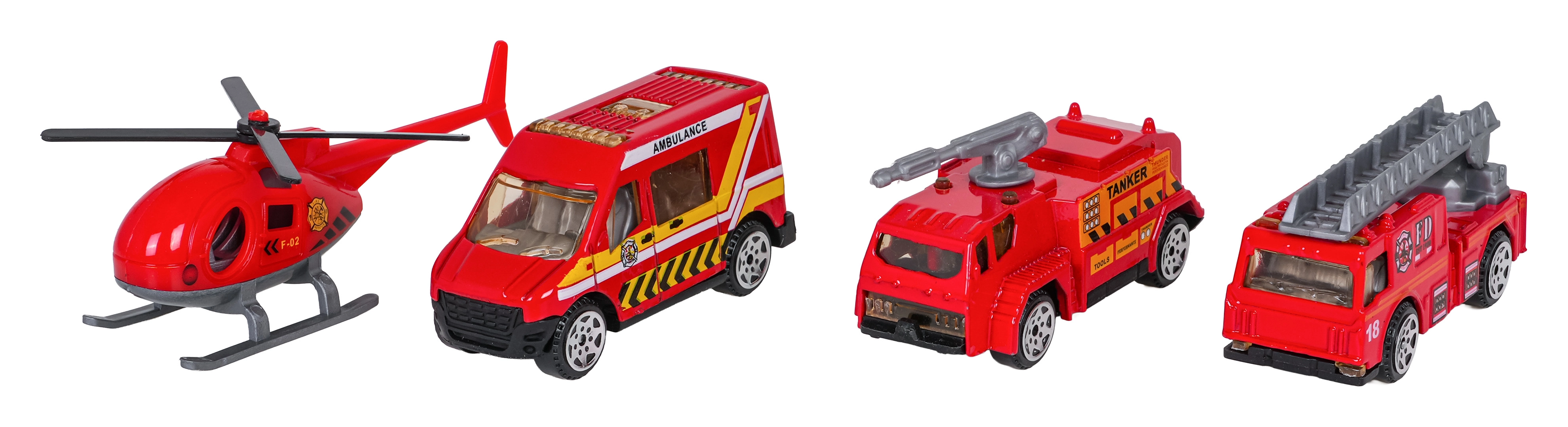 Trīs izturīgas metāla mašīnītes ar kustīgām detaļām un detalizēts helikopters paplašina spēles iespējas un padara darbību reālistiskāku.