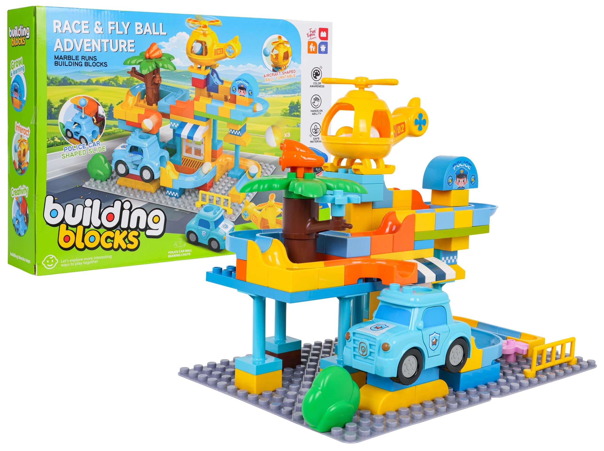 Iepakojumā atradīsiet policijas mašīnīti, helikopteru un 3 bumbiņas. Pārdomāta detaļa – atveres gan mašīnītē, gan helikopterā – ļauj bumbiņām lidot cauri un piešķir spēlei jaunu dimensiju. Būvkomplekts izgatavots no kvalitatīviem, bērniem drošiem materiāliem un ir piemērots bērniem no 3 gadu vecuma.