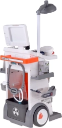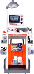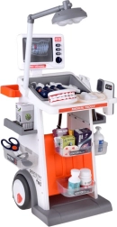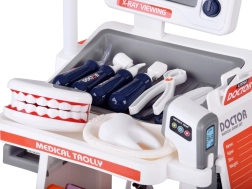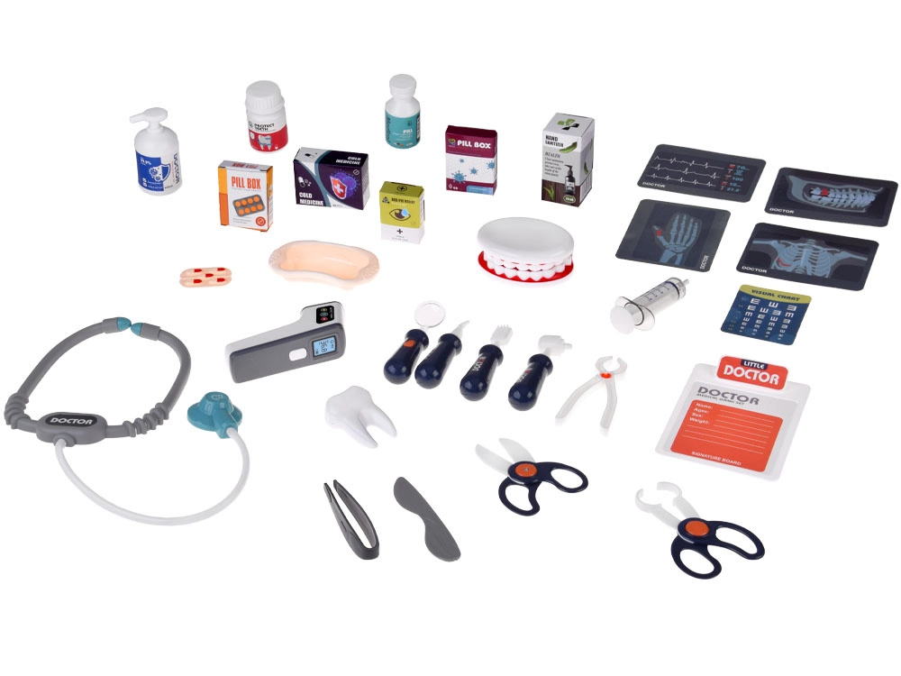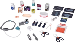 Komplektā ir plašs piederumu klāsts: stetoskops, termometrs, zobārsta spogulītis ar LED, pincetes, šķēres, zobu birste, kapsulas, “zāļu” kastītes, atverams žokļa modelis un atsevišķs “zobs”, EKG karte un rentgena kartītes. Pateicoties mobilajai konstrukcijai un uzglabāšanas plauktiem, komplekts ir ideāli piemērots kopīgai spēlei un kārtības uzturēšanai.