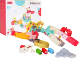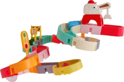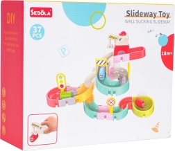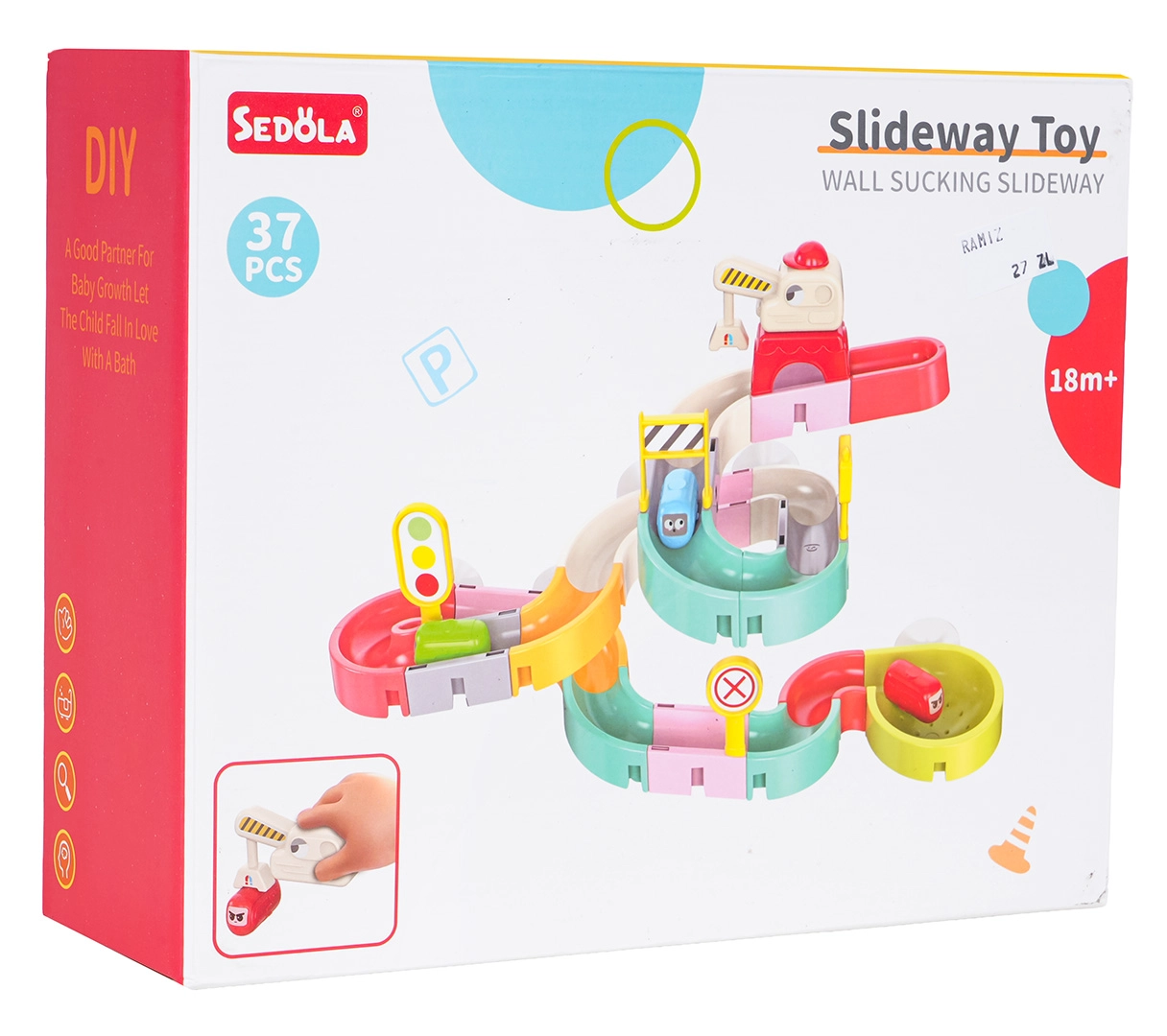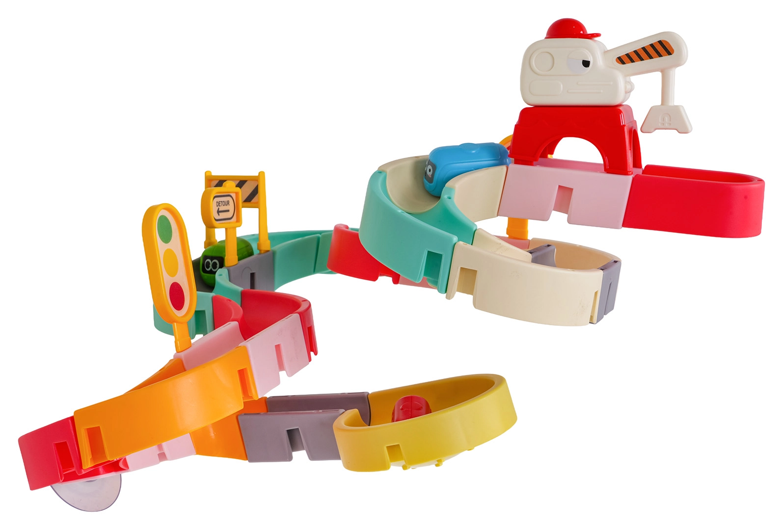 Izklaidējoša ūdens trase vannai ar piesūcekļiem pārvērš katru peldēšanos sacīkstēs. Pateicoties 37 detaļām, bērni var salikt krāsainu slidkalniņu, pa kuru miniautomašīnītes trauks zem ūdens straumes. Spēcīgi piesūcekļi nodrošina stingru stiprinājumu uz gludām virsmām, droši materiāli un košas krāsas veicina atklāšanas prieku un motorikas attīstību.