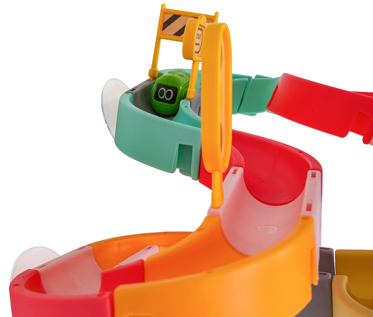 Uzbūvējiet savu ūdens sacīkšu trasi tieši vannā. Modulārās detaļas viegli savienojas, un pateicoties piesūcekļiem tās var piestiprināt pie flīzēm, vannas vai citām gludām virsmām. Atliek nolikt startā miniautomašīnīti un apliet to ar dušu – ūdens straume to aizdzīs pa trasi līdz pat ūdenim.