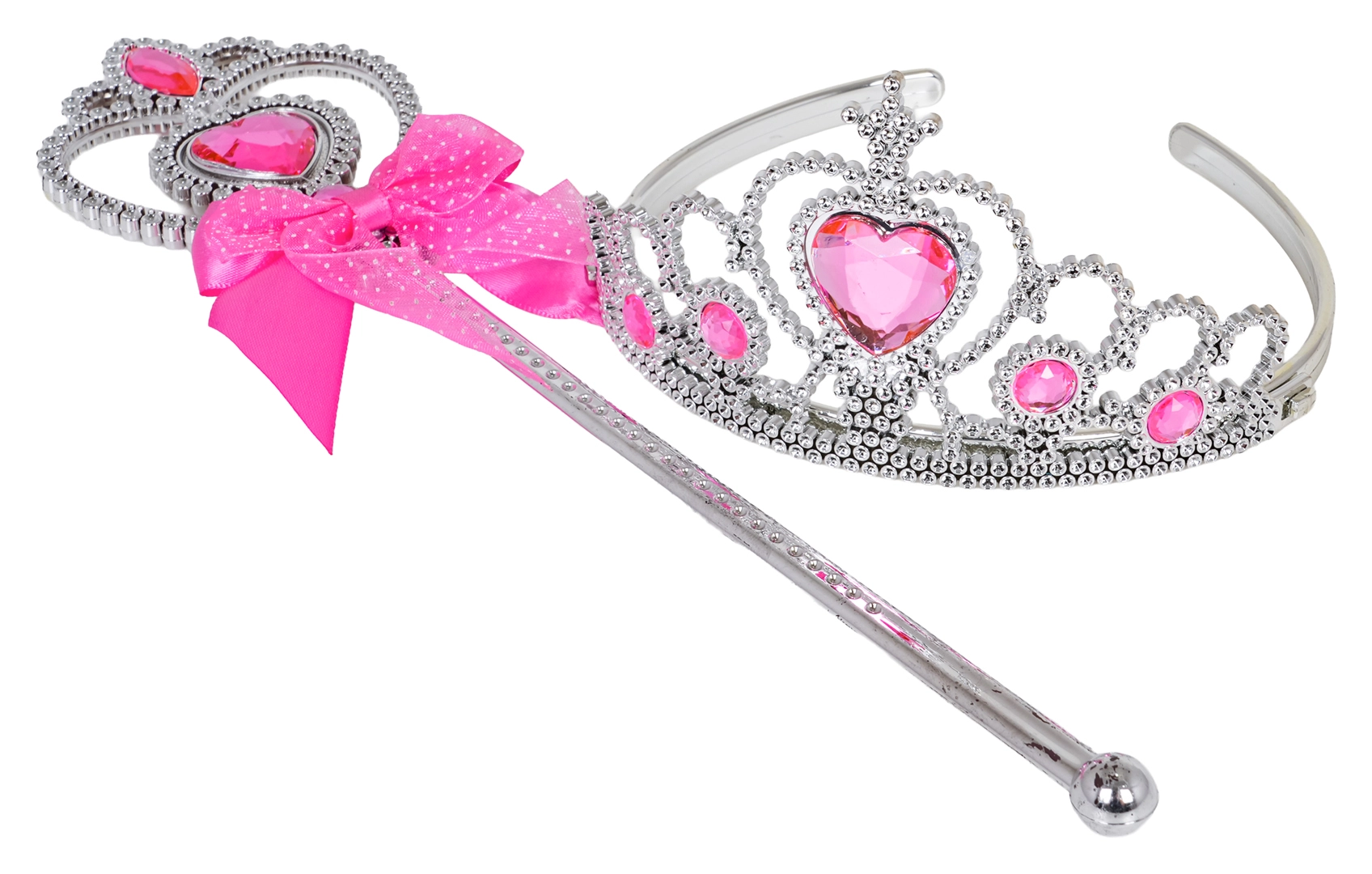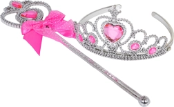 Sudrabains kronis ar rozā akmentiņiem un saskanīga nūjiņa piešķir kostīmam karalisku mirdzumu un veicina iztēli lomu spēlēs.