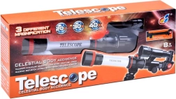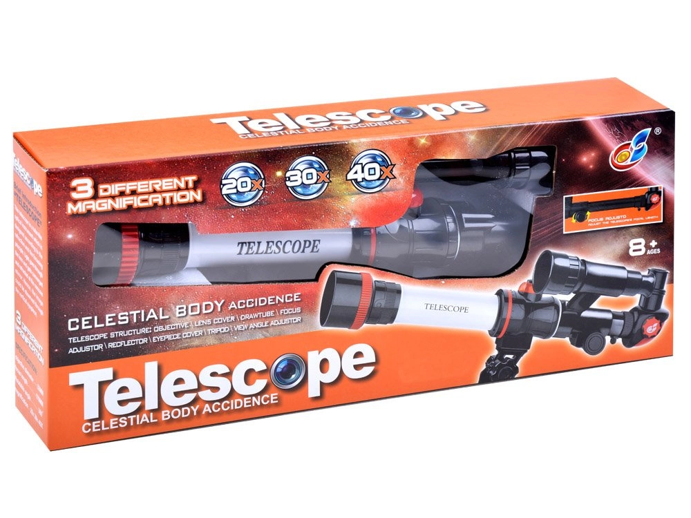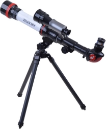 Atklājiet nakts debesu pasauli ar vieglu un viegli lietojamu bērnu teleskopu uz statīva. Tas piedāvā maināmus okulārus ar palielinājumu 20×, 30× un 40×, augstu attēla kontrastu un labu krāsu attēlojumu. Pateicoties diagonālajam prizmam novērošana ir ērta, kompaktais statīvs nodrošina stabilitāti, bet slēgta tipa tubuss sargā optiku no putekļiem. Lieliska izvēle pirmajiem mazā astronoma soļiem un arī sauszemes novērojumiem.