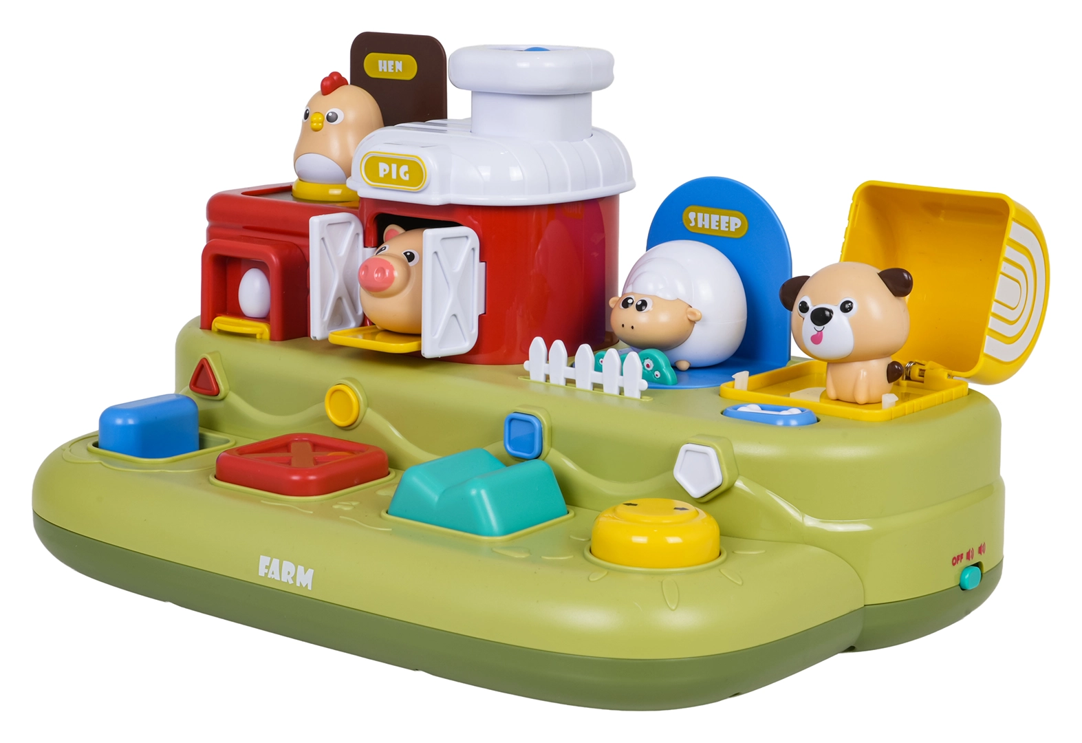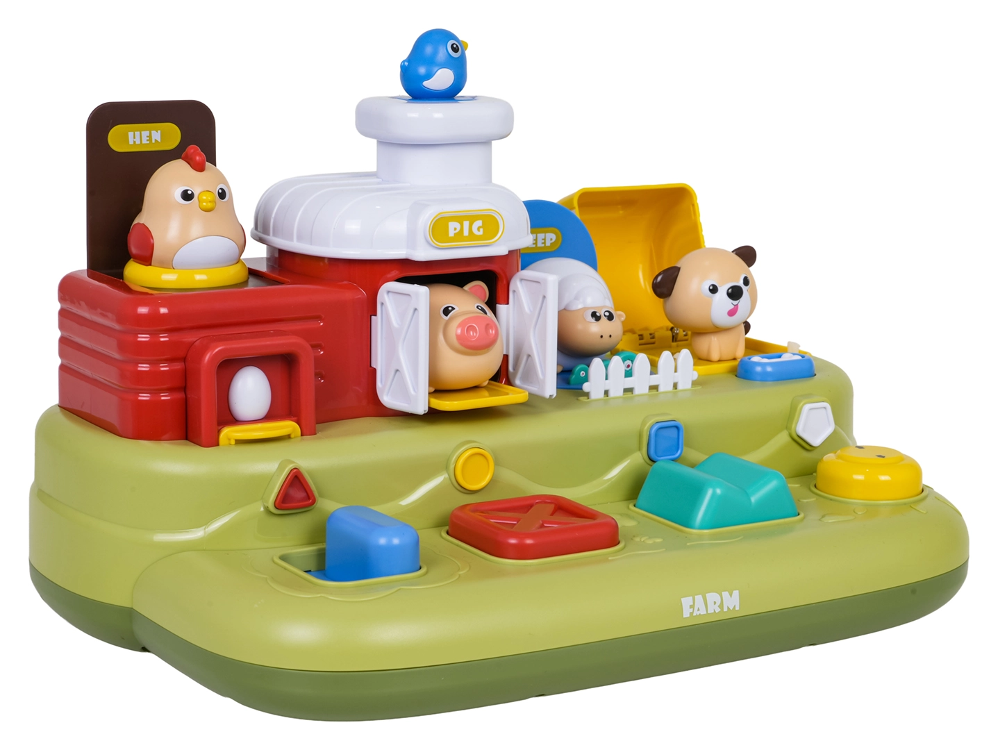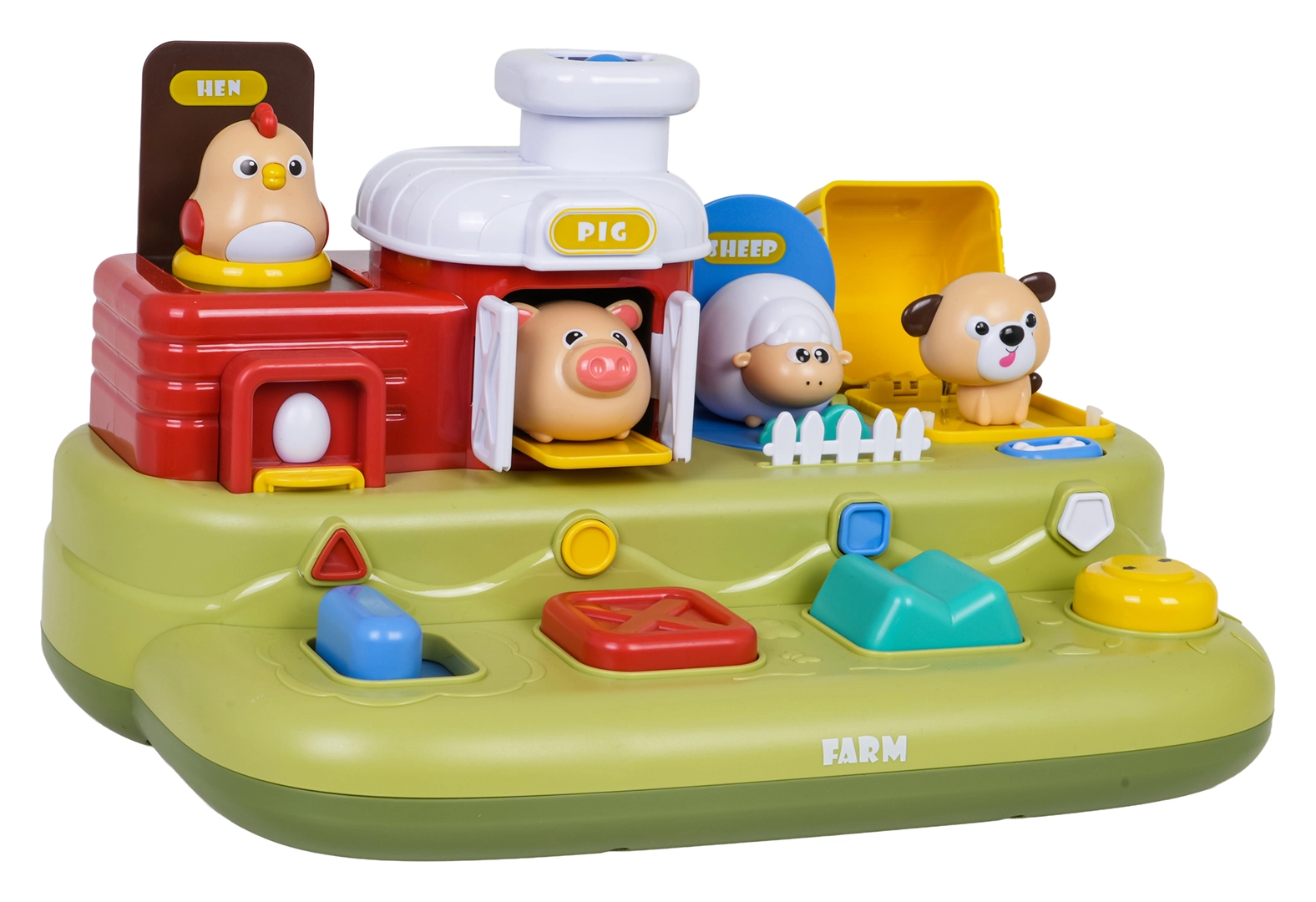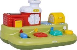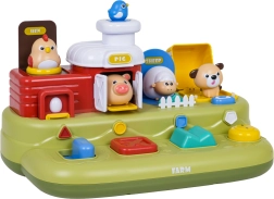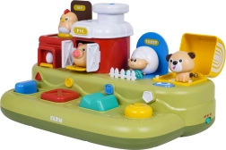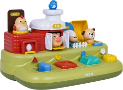 Šī jautrā ferma bērniem sniedz daudz atklājumu: pabīdot zilo slīdni, izlec cālītis; nospiežot sarkano pogu, atveras durtiņas ar sivēntiņu; nospiežot zaļo, parādās aitiņa, bet pagriežot dzelteno vadības ritenīti, izlūko sunītis. Virs vadības elementiem ir papildu pogas, kas iedarbina melodijas, dzīvnieku skaņas un citus efektus.