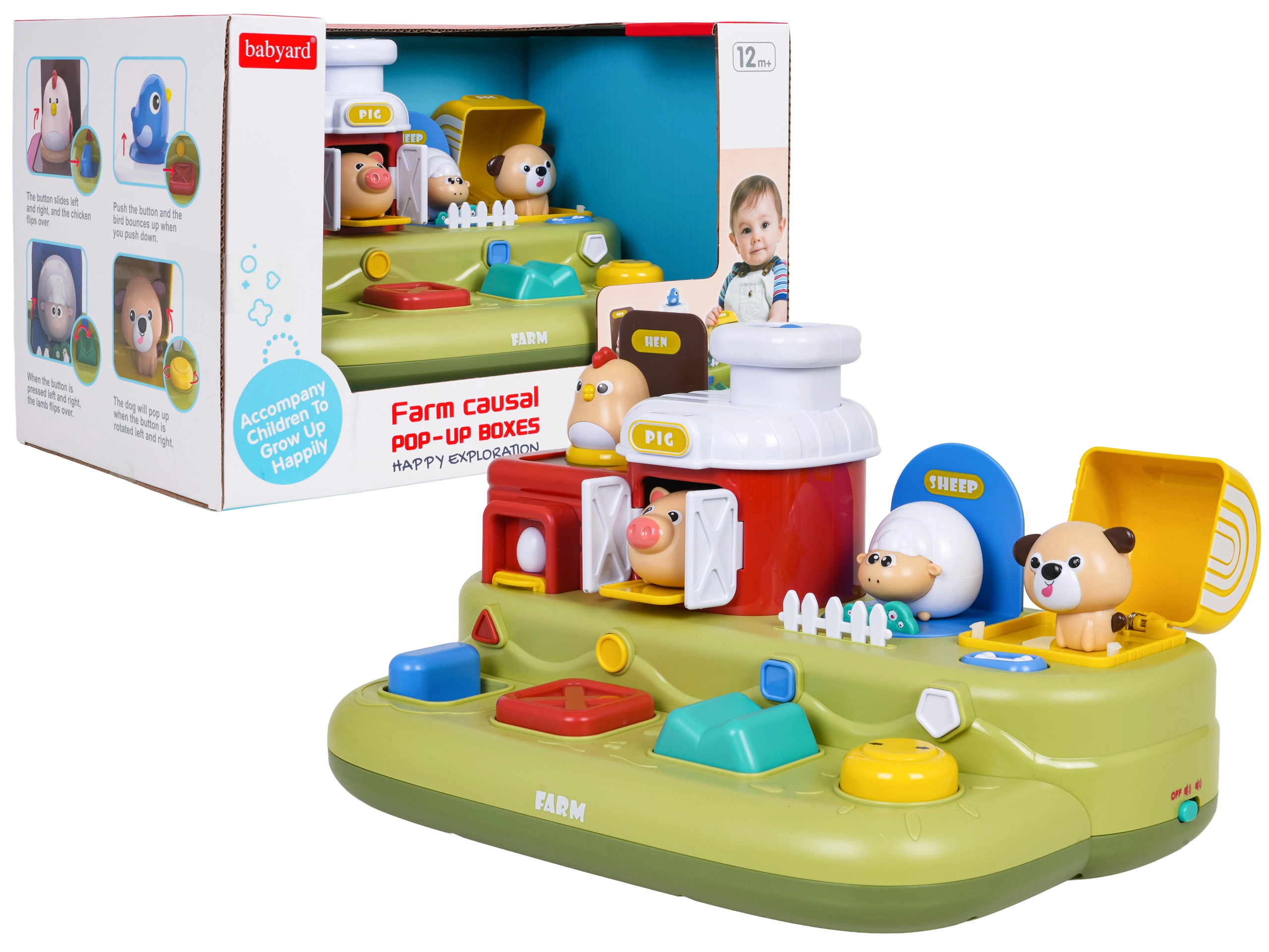 Dažādi mehānismi (spiediens, pabīde, pagriešana) atklāj cālīti, sivēntiņu, aitiņu un sunīti. Bērni ātri saprot saikni starp darbību un reakciju un vienlaikus vingrina smalko motoriku.