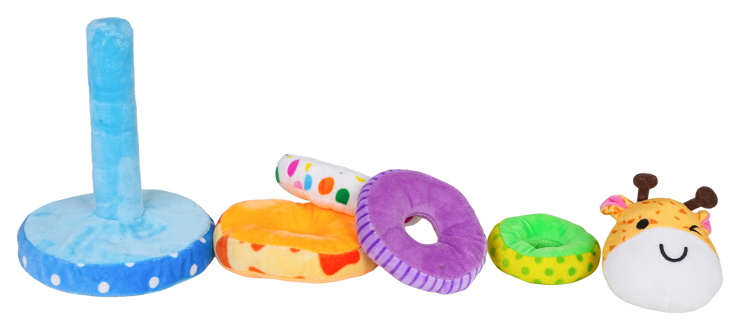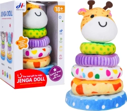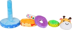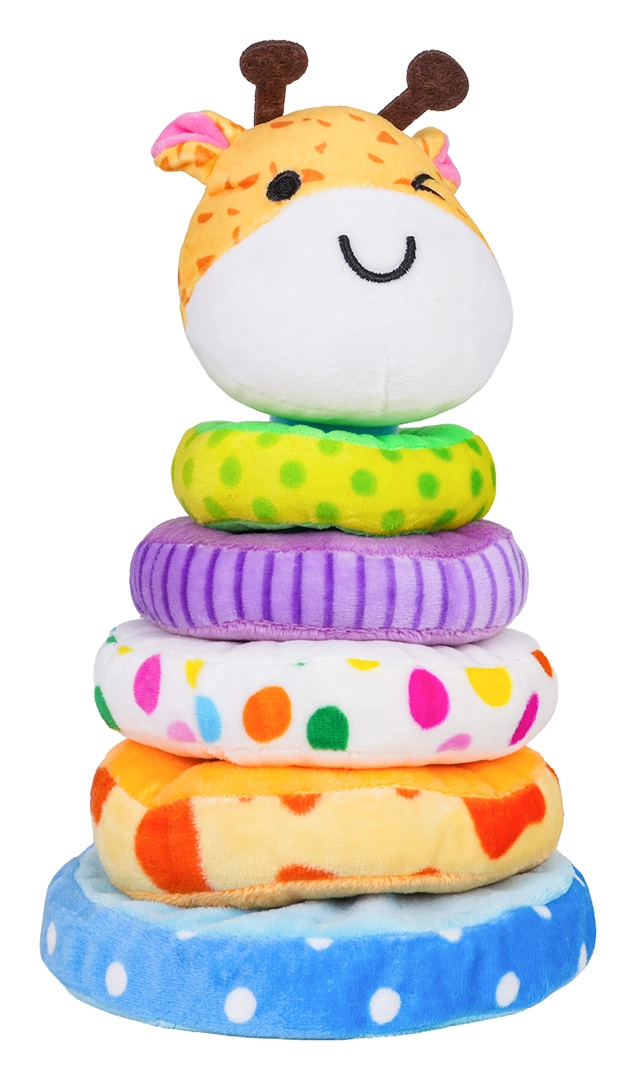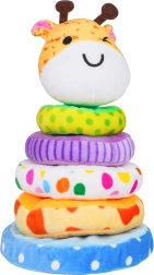 Mīlīgā mīkstā piramīda žirafes formā attīsta sīko motoriku, acu–roku koordināciju un māca šķirot pēc izmēra. Krāsainie, mīkstie plīša gredzeni aicina pieskarties un droši rotaļāties. Žirafes galviņā paslēpta tauriņa (pīkstulis), kas, nospiežot, izdod skaņu un rosina maņu uztveri. Ideāla rotaļlieta bērniem no 18 mēnešiem.