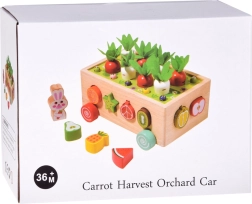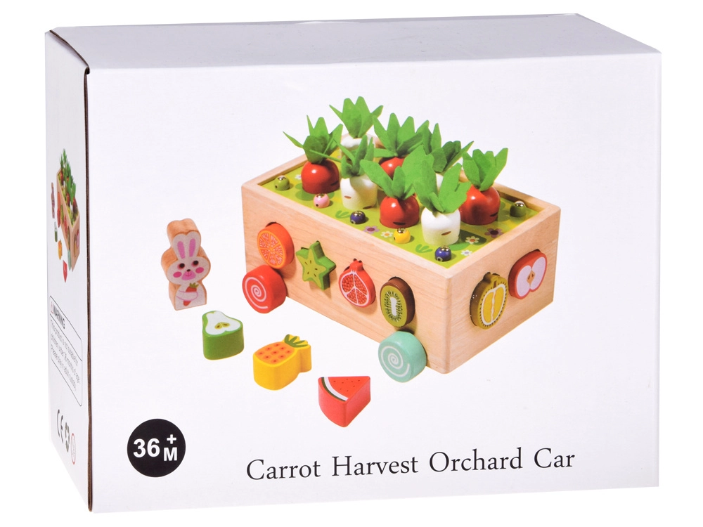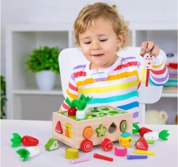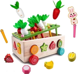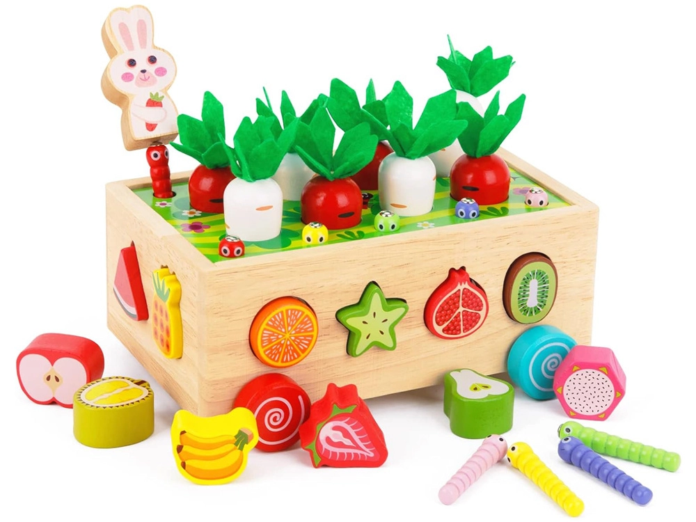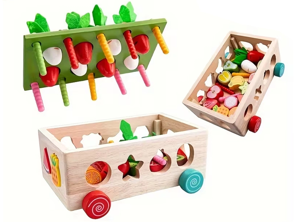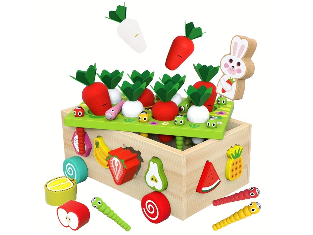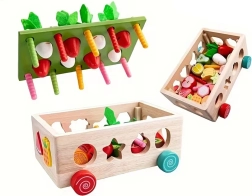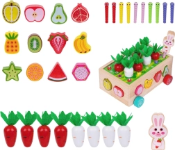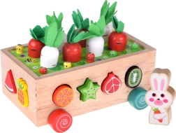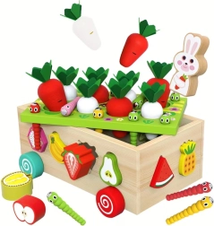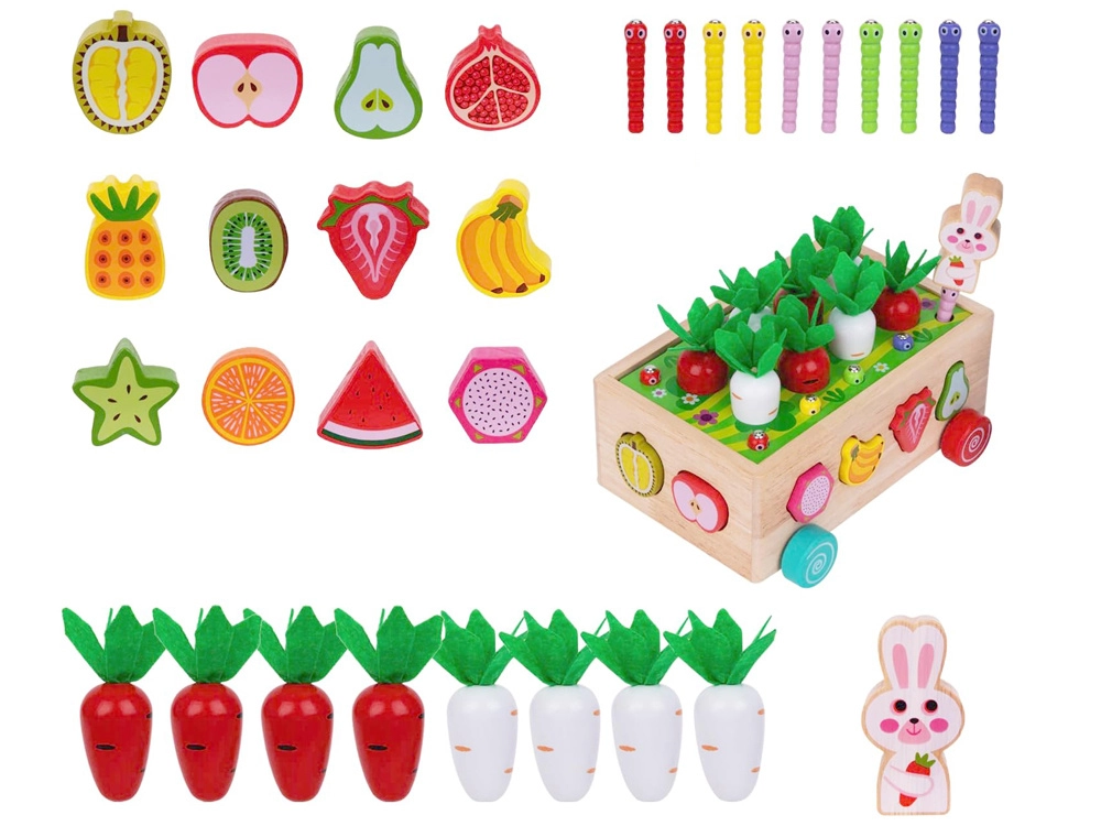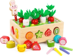 Šis daudzfunkcionālais koka komplekts Montessori garā piedāvā bērniem plašu nodarbību klāstu: burkāniņu ar filca lakstiem “stādīšanu” un izraušanu, magnētisku tārpiņu ķeršanu ar trusīša figūriņu un klasisku krāsainu augļu formu šķirošanu atbilstošajos caurumos. Pateicoties izturīgajai konstrukcijai un gludām malām, rotaļlieta ir droša un noturīga ikdienas lietošanai.