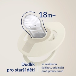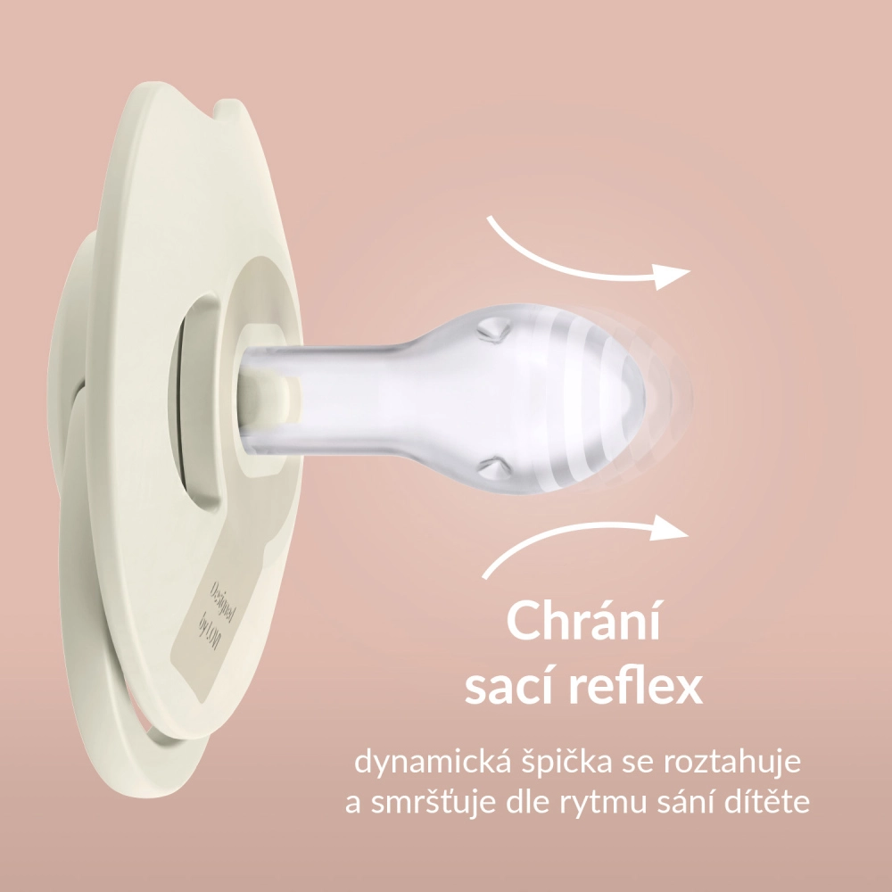 Viegls un ergonomisks profilēts vairogs ar ventilācijas atverēm minimizē kontaktu ar ādu un ļauj brīvi cirkulēt gaisam, samazinot kairinājuma risku. Izturīgais silikons saglabā formu mutē, plānais kakliņš un saplacinātais uzgalis veicina pareizu smaganu un mēles darbību un samazina maloklūzijas risku. Stilīgs, harmonisks dizains lieliski saskan ar bērna piederumiem.