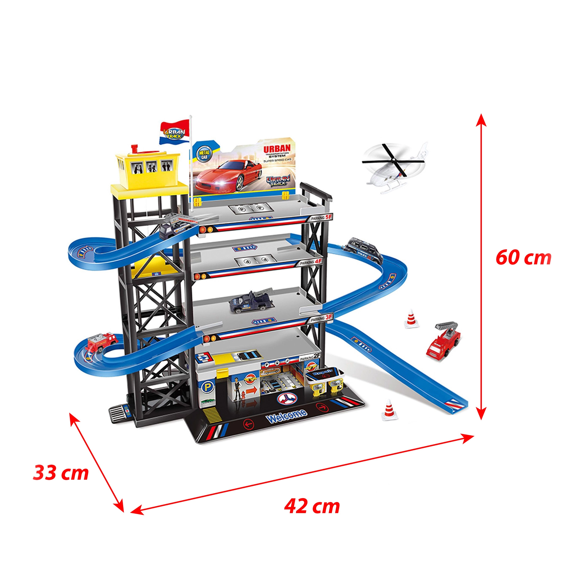 Sakārto savu autoparku pārskatāmā četrstāvu garāžā ar helikopteru laukumu! Komplektā ietilpst 4 stāvi, helikopters un 3 metāla mašīnītes apmēram 7–8 cm garumā. Pēc salikšanas garāžas izmēri ir 42 × 60 × 33 cm, piemērota bērniem no 4 gadu vecuma. Konkrētus variantus nav iespējams izvēlēties. Brīdinājums: produkts ir iepakots rezerves iepakojumā.