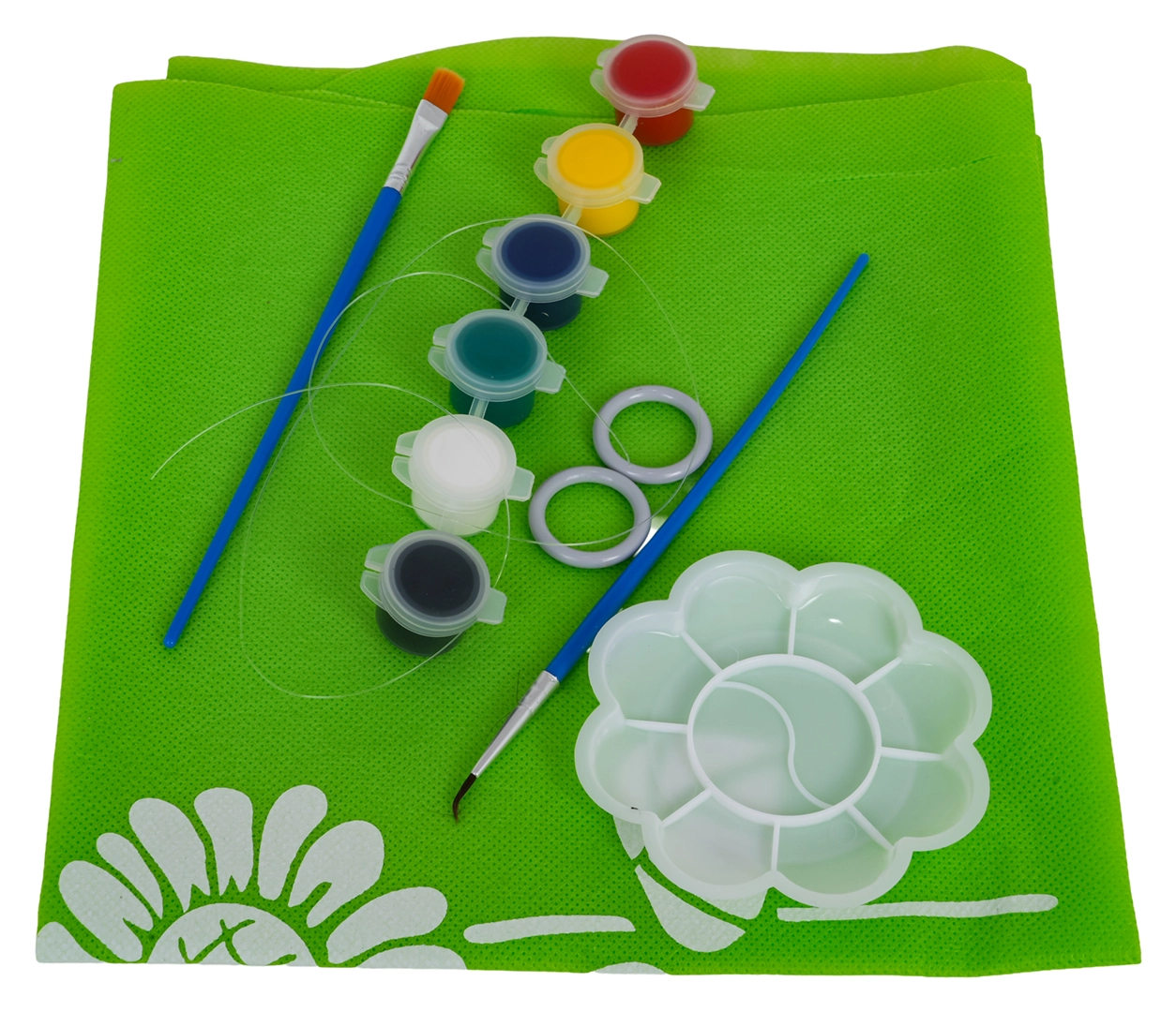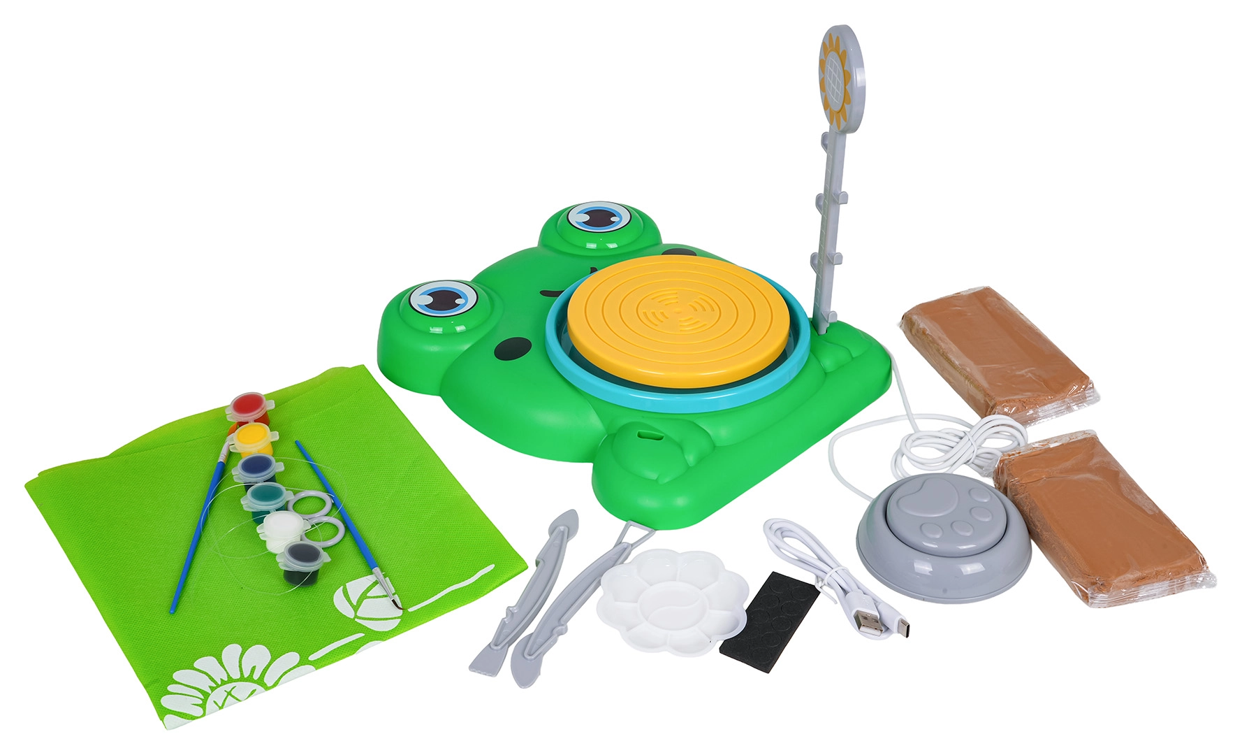 Vardes formas pamatne, rotējošs ritenis, kāju pedālis, lampiņa, instrumenti, krāsas un 2× māls – viss tūlītējai veidošanai un krāsošanai.