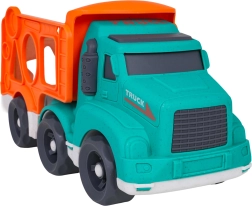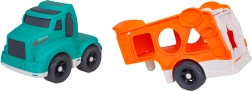 Komplektā ietilpst 2 atsevišķas mašīnītes radošai braukšanai. Bērni tās var iekraut, pārvadāt un izkraut pa pārvadātāja rampu.