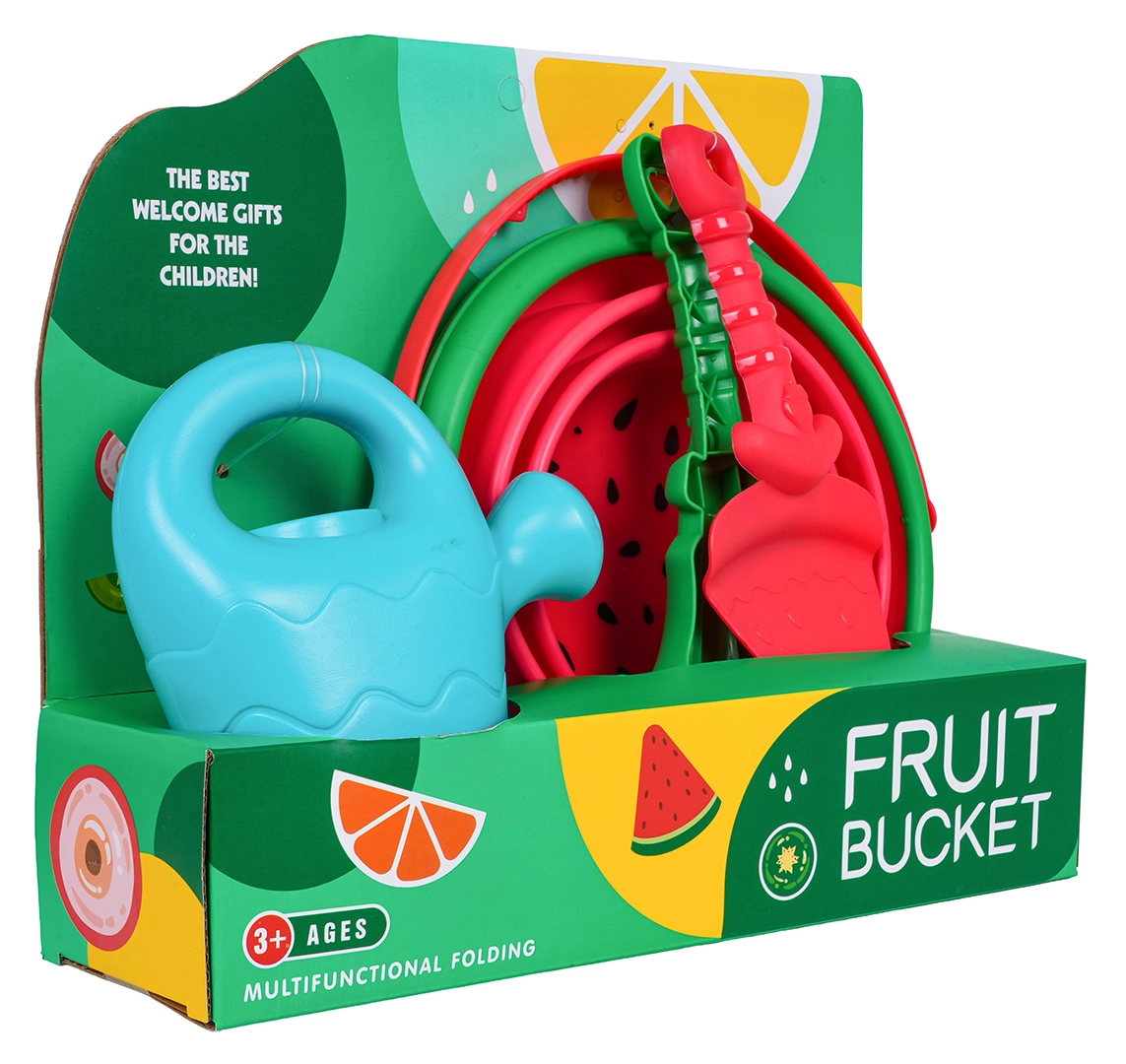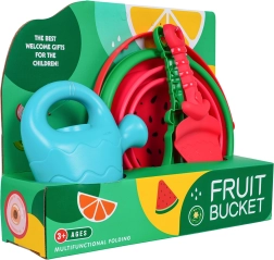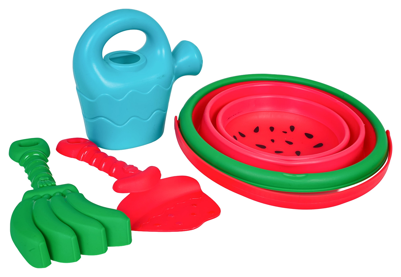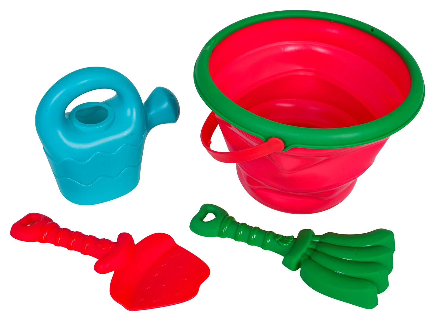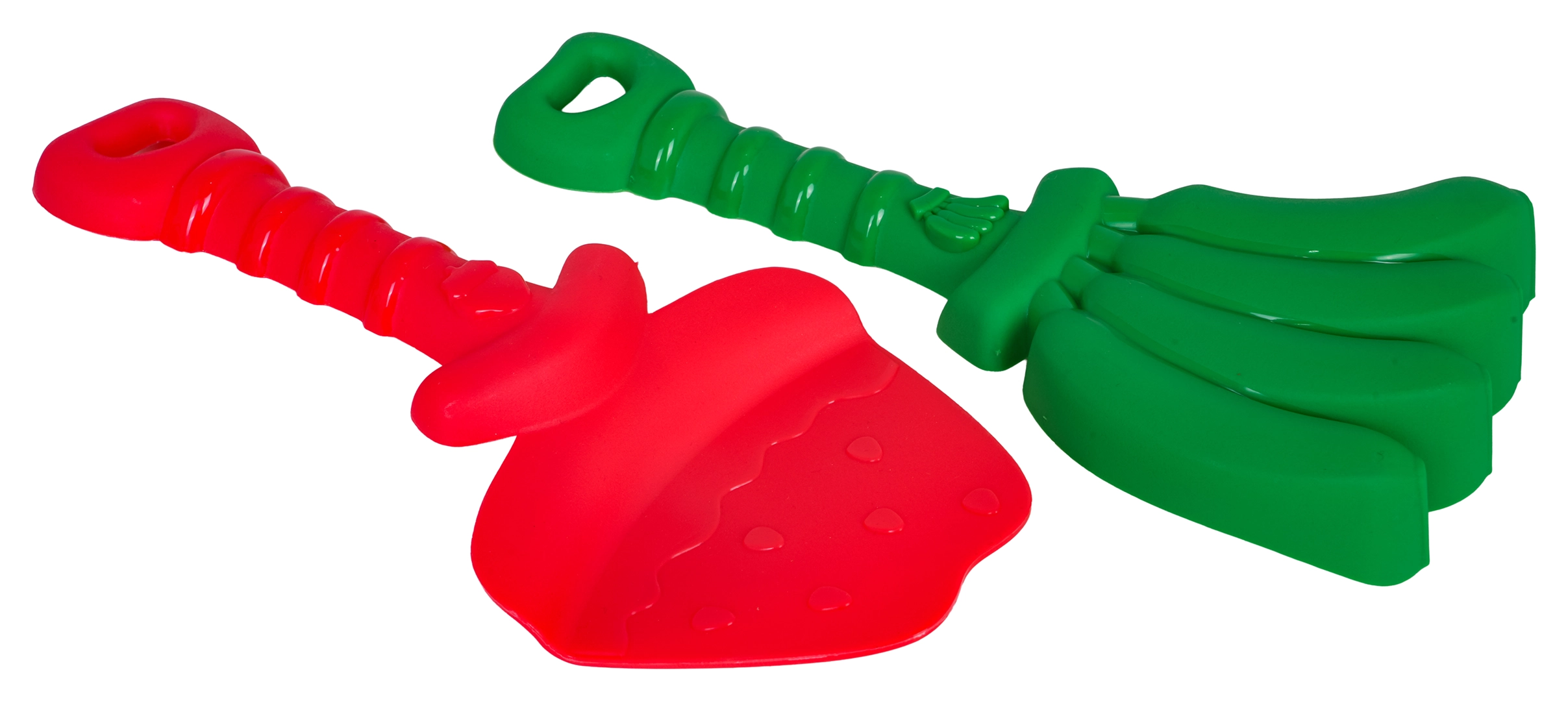 Lāpstiņa, grābeklītis un lejkanna ļauj bērniem rakt, grābt, veidot un pārliet ūdeni – viss vienā komplektā.