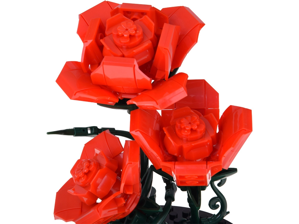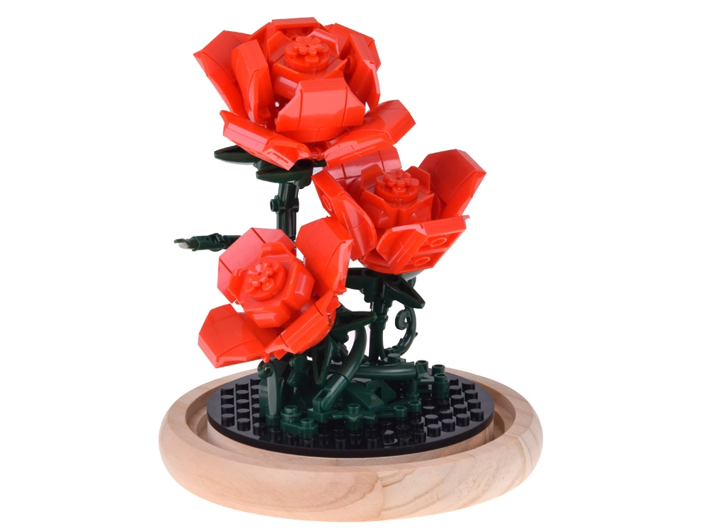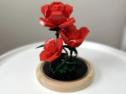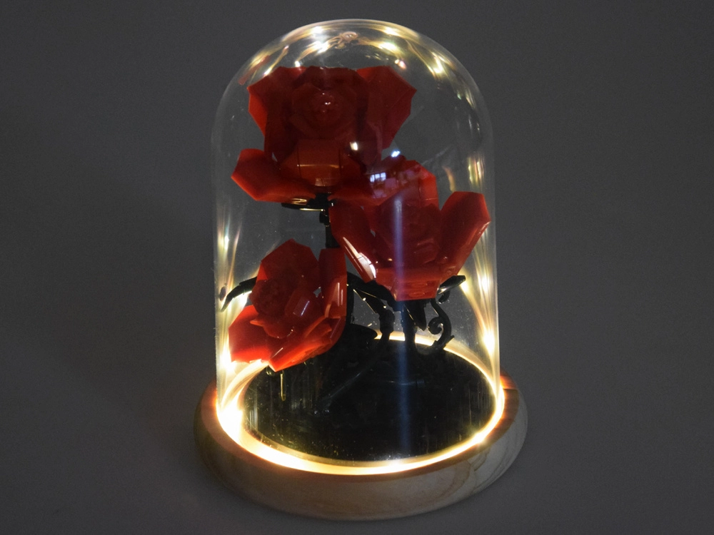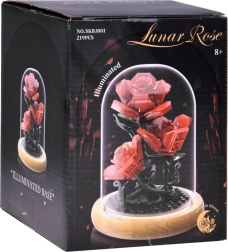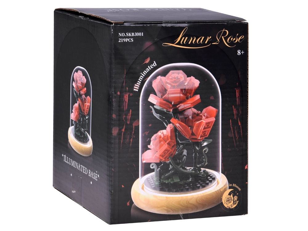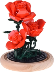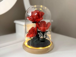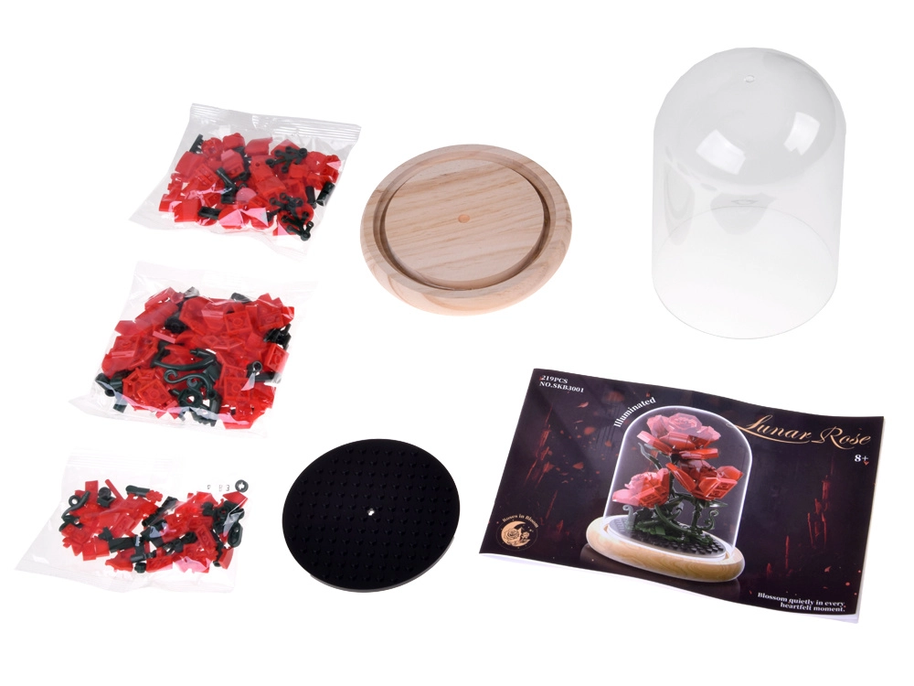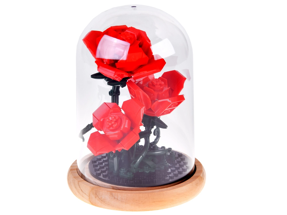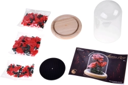 Izveidojiet iespaidīgu dekorāciju no klucīšiem – sarkana roze zem caurspīdīga kupola ar LED apgaismojumu iemirdzēsies uz plaukta vai rakstāmgalda. No 219 detaļām saliksiet elegantus ziedus uz koka pamatnes, kas ir lieliski piemēroti atpūtai, radošuma attīstīšanai un kā stilīga dāvana.