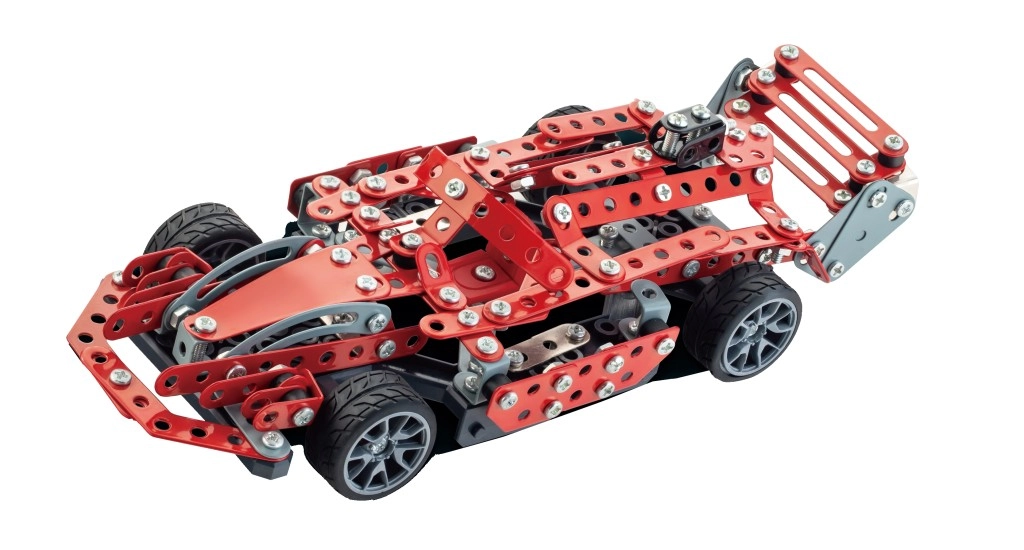 Saliec savu sacīkšu auto no metāla! Šis metāla formulas konstruktors ar 287 detaļām apvieno izturīgas metāla sastāvdaļas un plastmasas papildinājumus, kas tiek savienoti ar skrūvēm un uzgriežņiem. Piedāvā gan jautru, gan izaicinošu būvēšanu, attīsta pacietību, veiklību un tehnisko domāšanu – lieliska izvēle gan maziem, gan lieliem konstruktoriem.