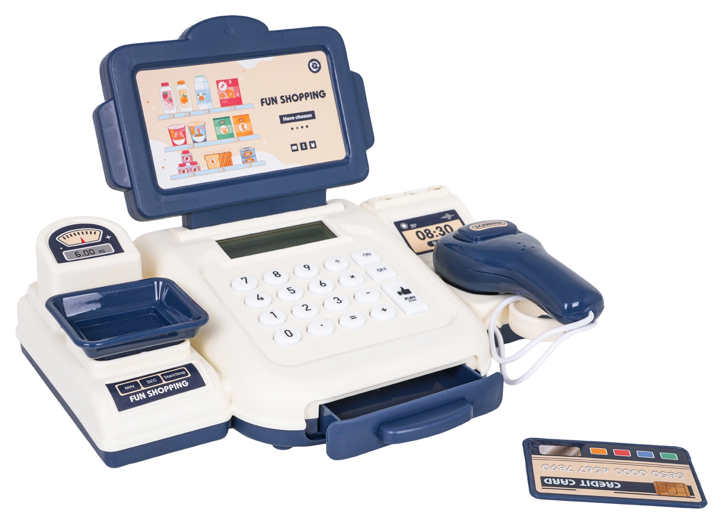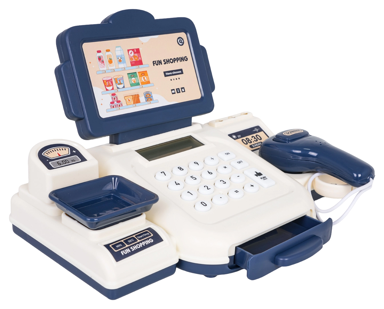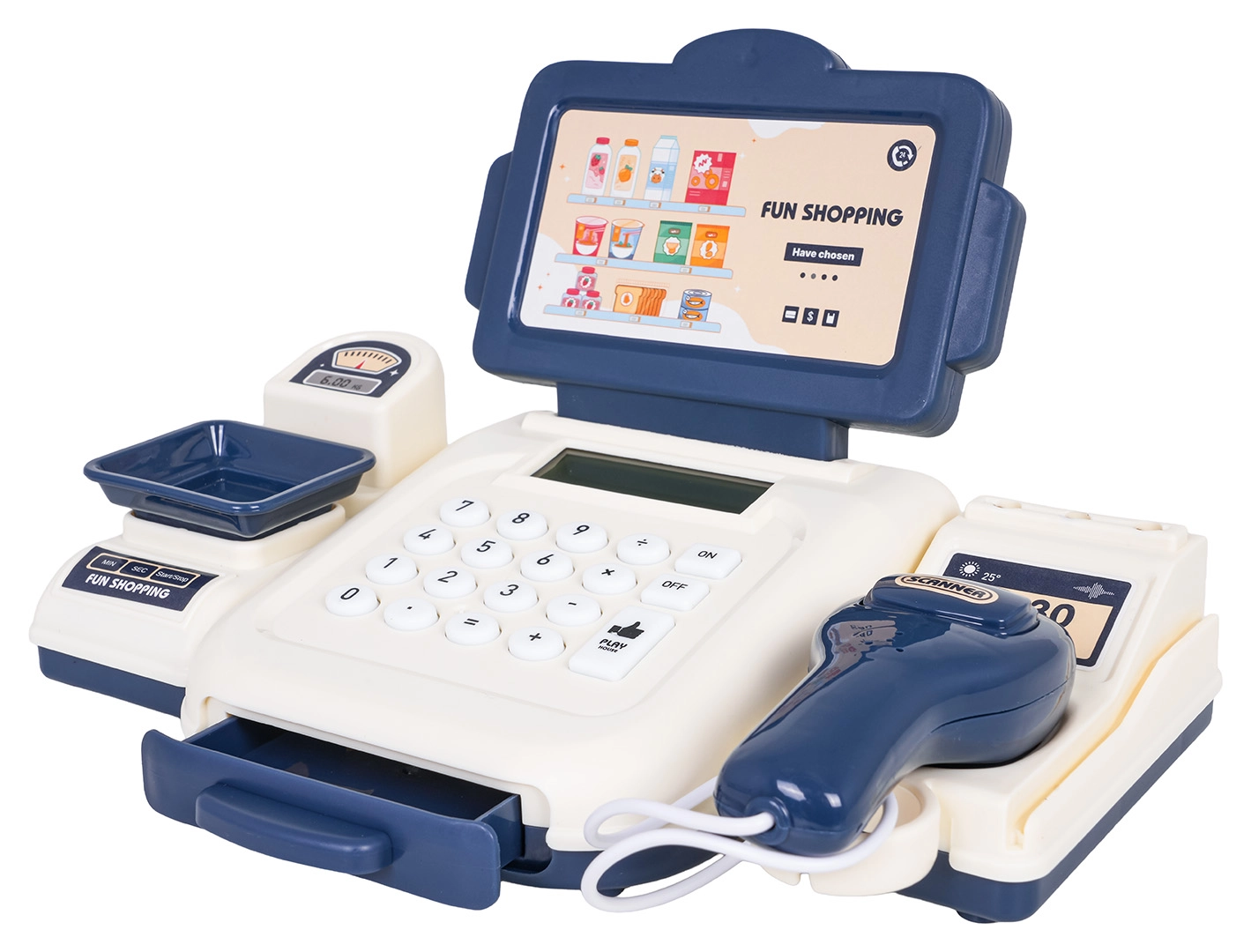 Novietojiet preces uz svariem, aprēķiniet summu un droši ievietojiet banknotes izvelkamajā atvilktnē – spēle kā īstā veikalā.
