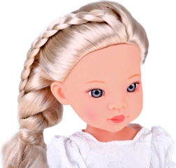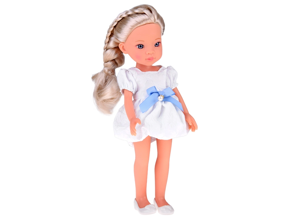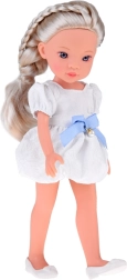 Komplektā ir daiļa baltā kleita ar zilu lenti un smalku pērļu rotājumu, kā arī baltas balerīnas. Detalizēti veidotā sejiņa ar izteiksmīgām, mirdzošām acīm piešķir lellei reālistisku izteiksmi un padara to par skaistu sabiedroto bērnistabā un kolekcijā.