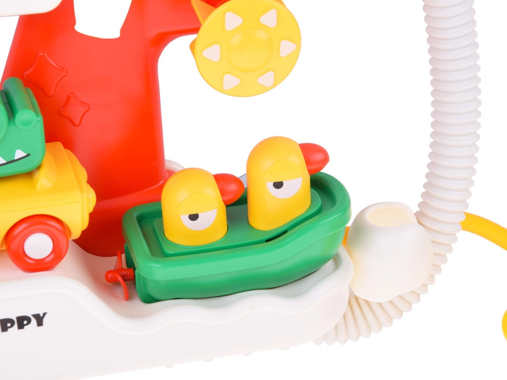 Šī mīlīgā vannas stacija ar krokodilu bērniem sniedz bezgalīgu ūdens prieku. Elektriskais sūknis cirkulē ūdeni un rada nepārtrauktas dušas efektu, kas iegriež ritenīšus un aktivizē dažādus ūdens efektus. Komplektā ir arī peldošas pīlītes laiviņā, automobilītis ar krokodilu un krūzīte liešanai.