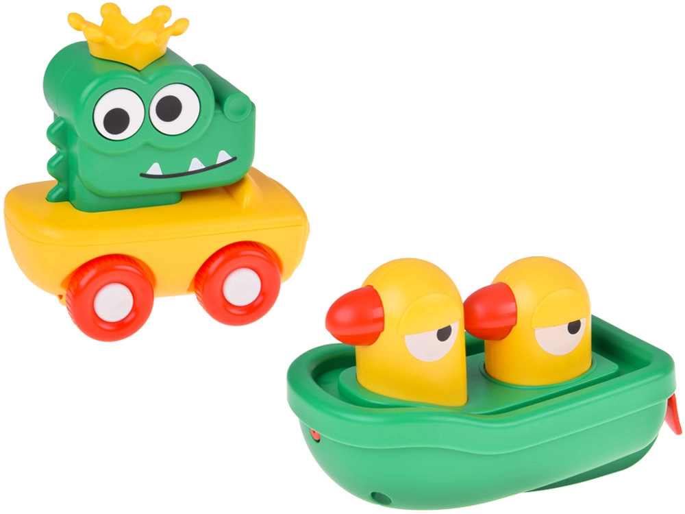 Komplektā ir krokodils automobilītī, laiviņa ar divām pīlītēm un liešanas krūzīte. Peldošie elementi rosina iztēli un pagarina rotaļu laiku vannā.