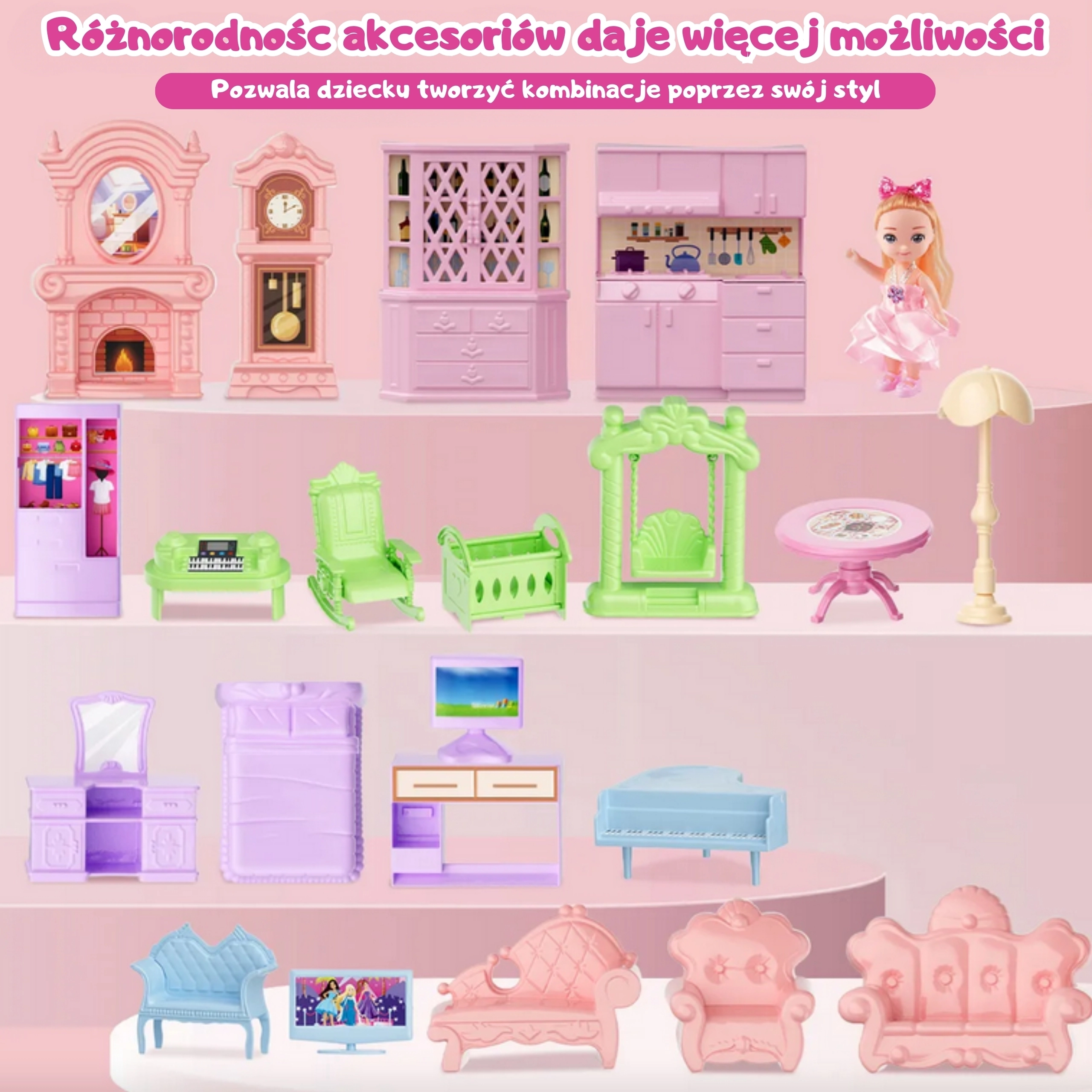 Komplektā ir bagātīgs piederumu klāsts – mēbeles, dekorācijas un figūriņas, lai bērni varētu brīvi pārkārtot un plānot interjeru. Droši materiāli, noapaļotas malas un kvalitatīvs izpildījums nodrošina bezrūpīgas rotaļas jau no 3 gadu vecuma.