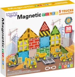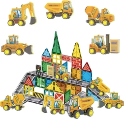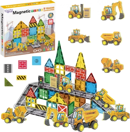 - Magnētiskie klucīši ar celtniecības transportlīdzekļiem
