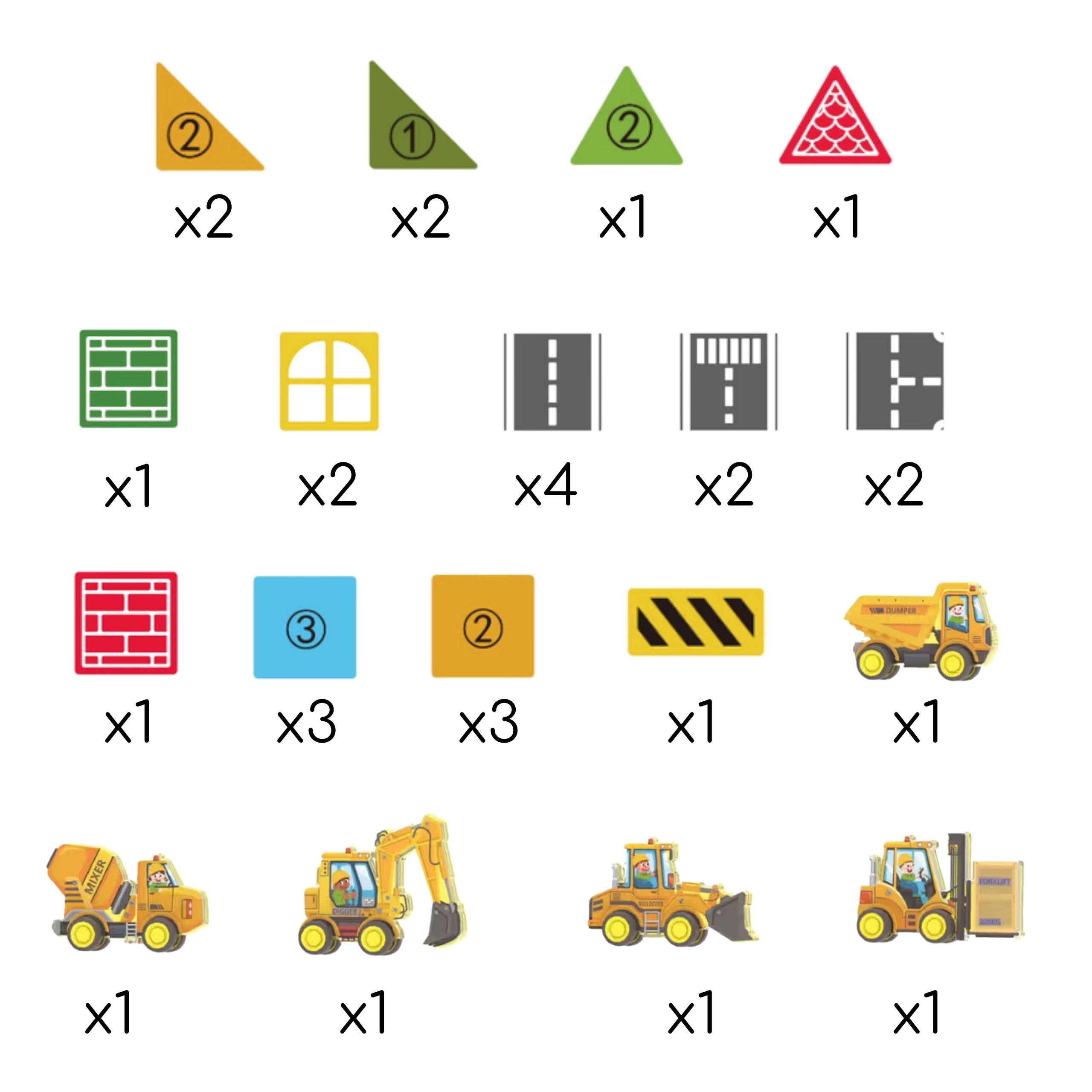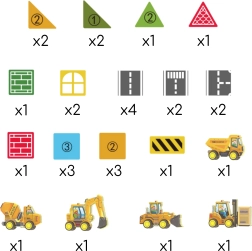 - 12 × kvadrāts, 2 × trijstūris, 4 × trijstūris (dažādi tipi), 4 × ceļš, 2 × logs, 1 × vārti