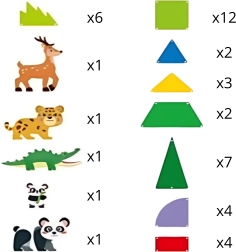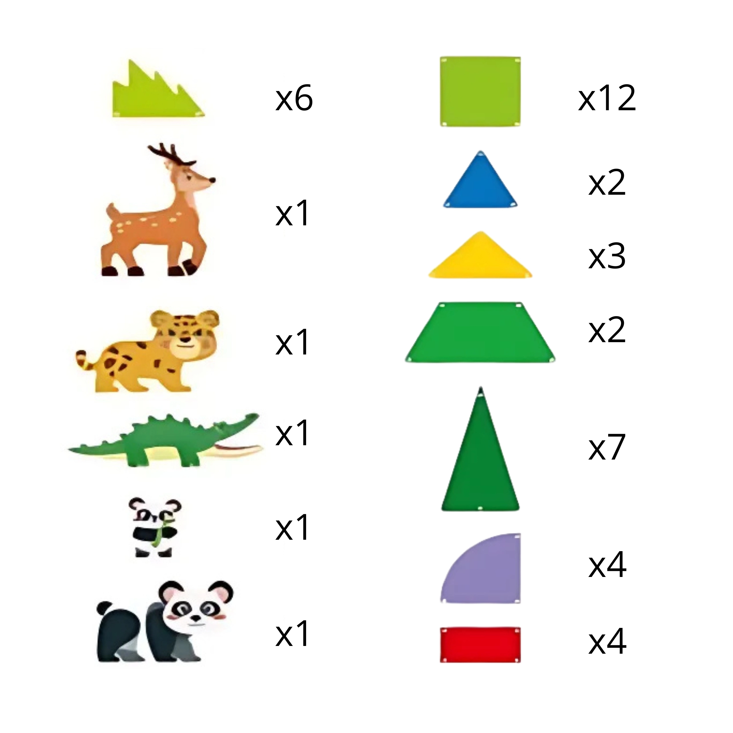 - Dzīvnieku figūriņas: 2× panda, leopards, briedis, krokodils