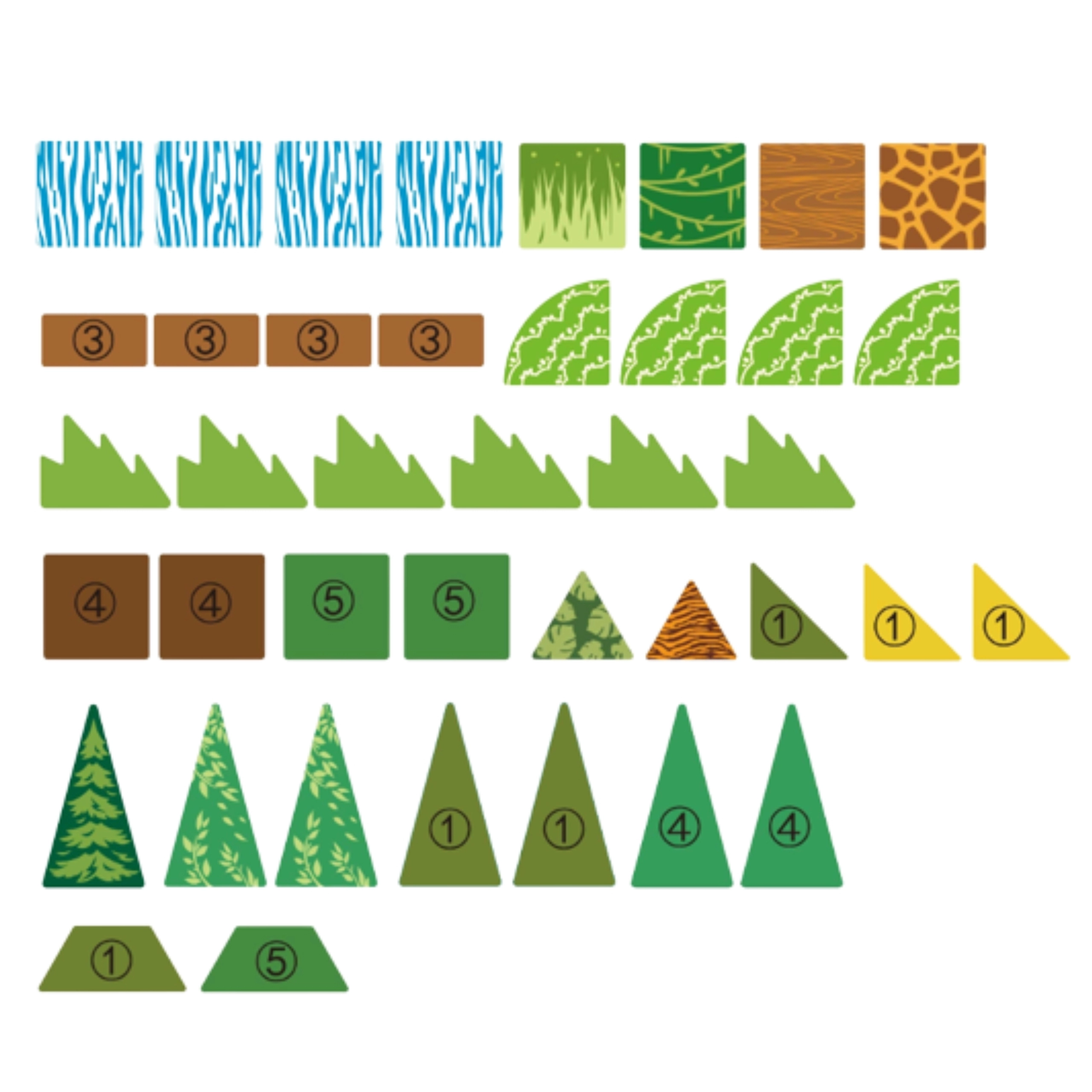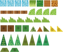 - 45 detaļas dažādās formās un krāsās, tostarp ūdenskritums, arka, krūmi un koki