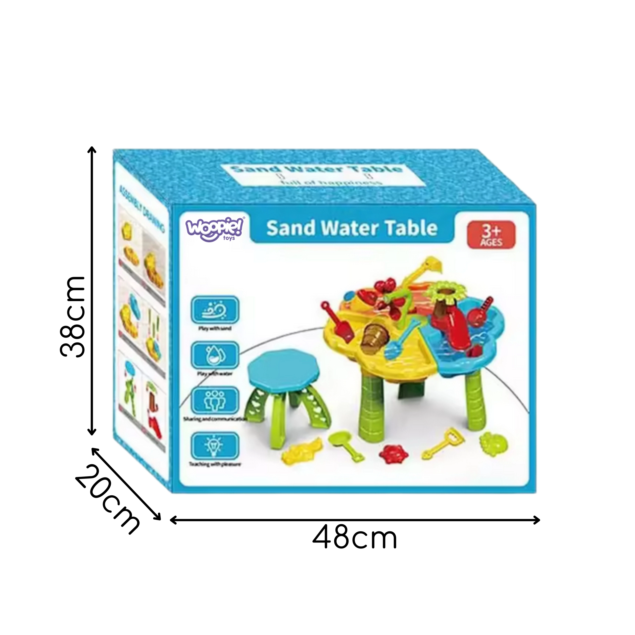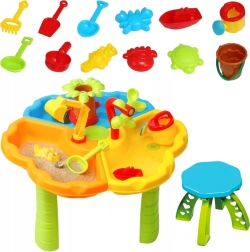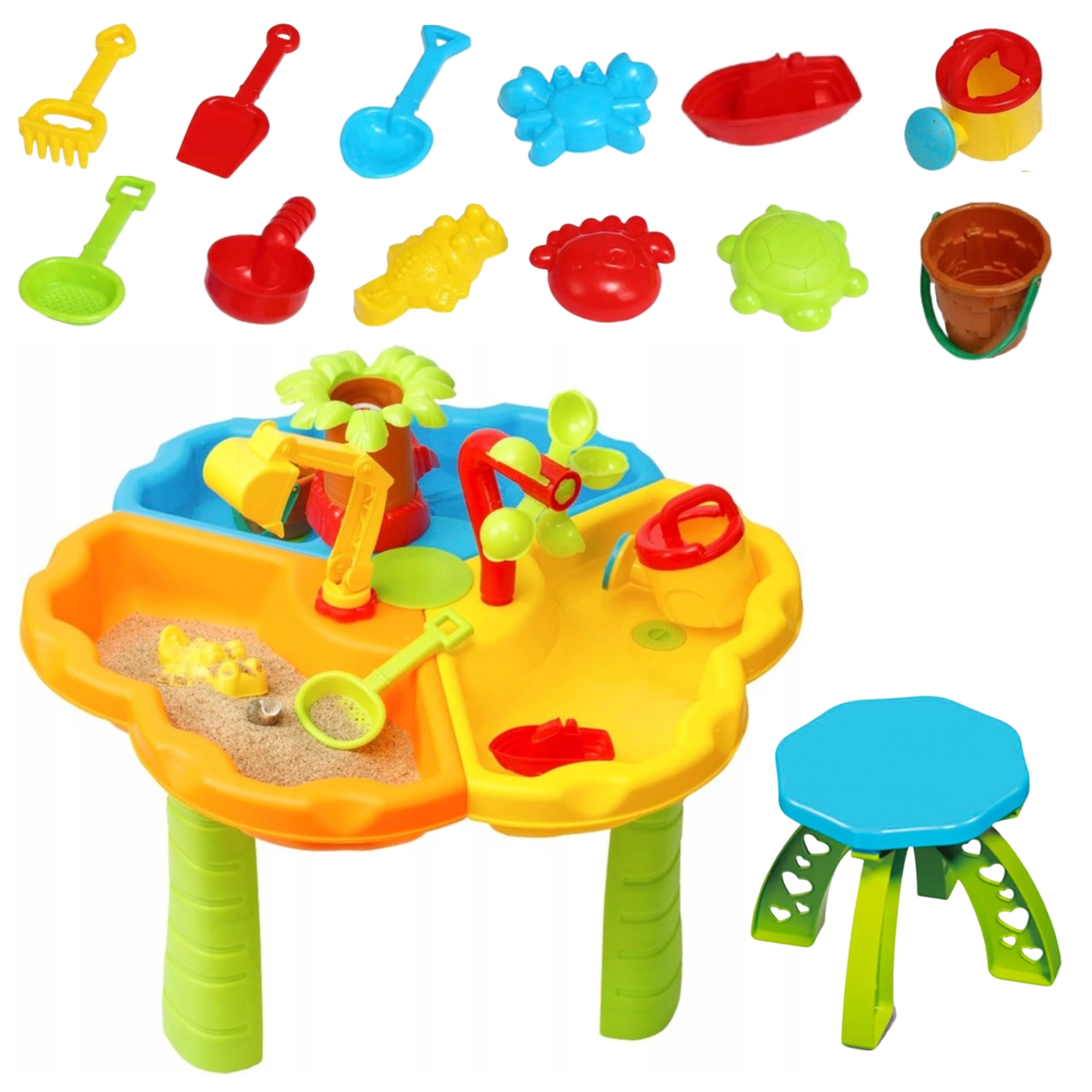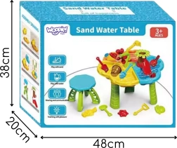 Spēļu galds 2in1 ūdenim un smiltīm ir ideāli piemērots dārzam, balkonam, terasei un bērnistabai. Trīsdaļīgās vanniņas ļauj vienlaicīgi eksperimentēt ar ūdeni, smiltīm un piederumiem, lai bērni varētu būvēt, lieties, sijāt un atklāt dažādas faktūras. Ergonomisks krēsliņš nodrošina komfortu un stabilitāti spēles laikā.