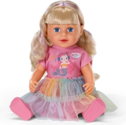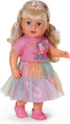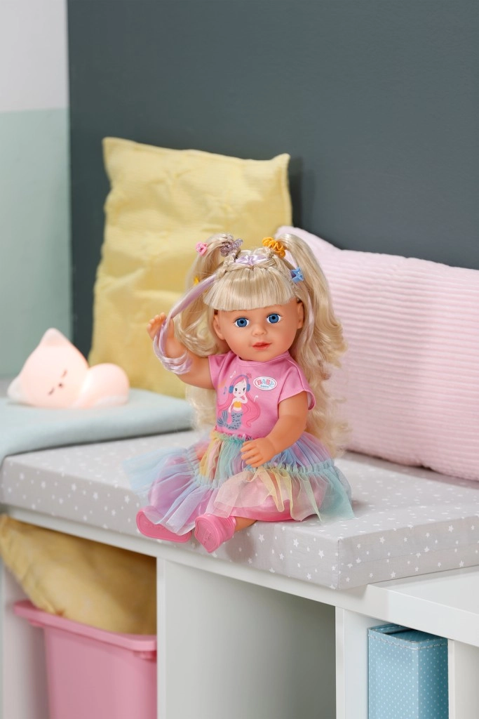 Carla valkā mīlīgu T‑kreklu ar apdruku, varavīksnes tilla svārkus un stilīgas kurpes. Stingrais korpuss ir piemērots arī ūdenim, tāpēc varēsiet jautri pavadīt laiku vannā. Kvalitatīvais izpildījums un izturīgi materiāli priecēs gan bērnus, gan vecākus.