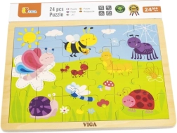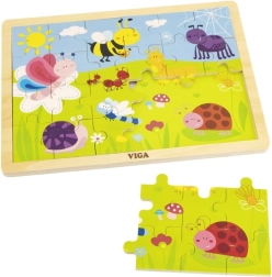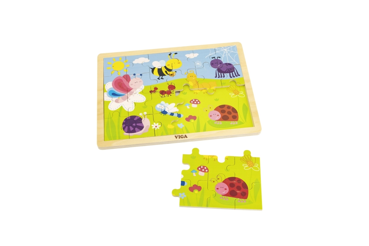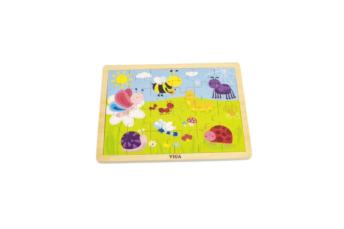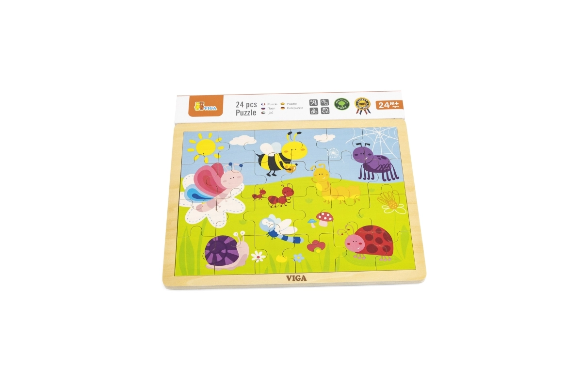 Atklājiet kvalitatīvu koka puzli VIGA ar pļavas ilustrāciju, kas pilna krāsainu kukaiņu – bites, tauriņa, mārītes un gliemeža. 24 izturīgu gabaliņu salikšana rāmī veicina pacietību un koncentrēšanos, kamēr bērni atpazīst formas, krāsas un draudzīgās ilustrācijas detaļas.