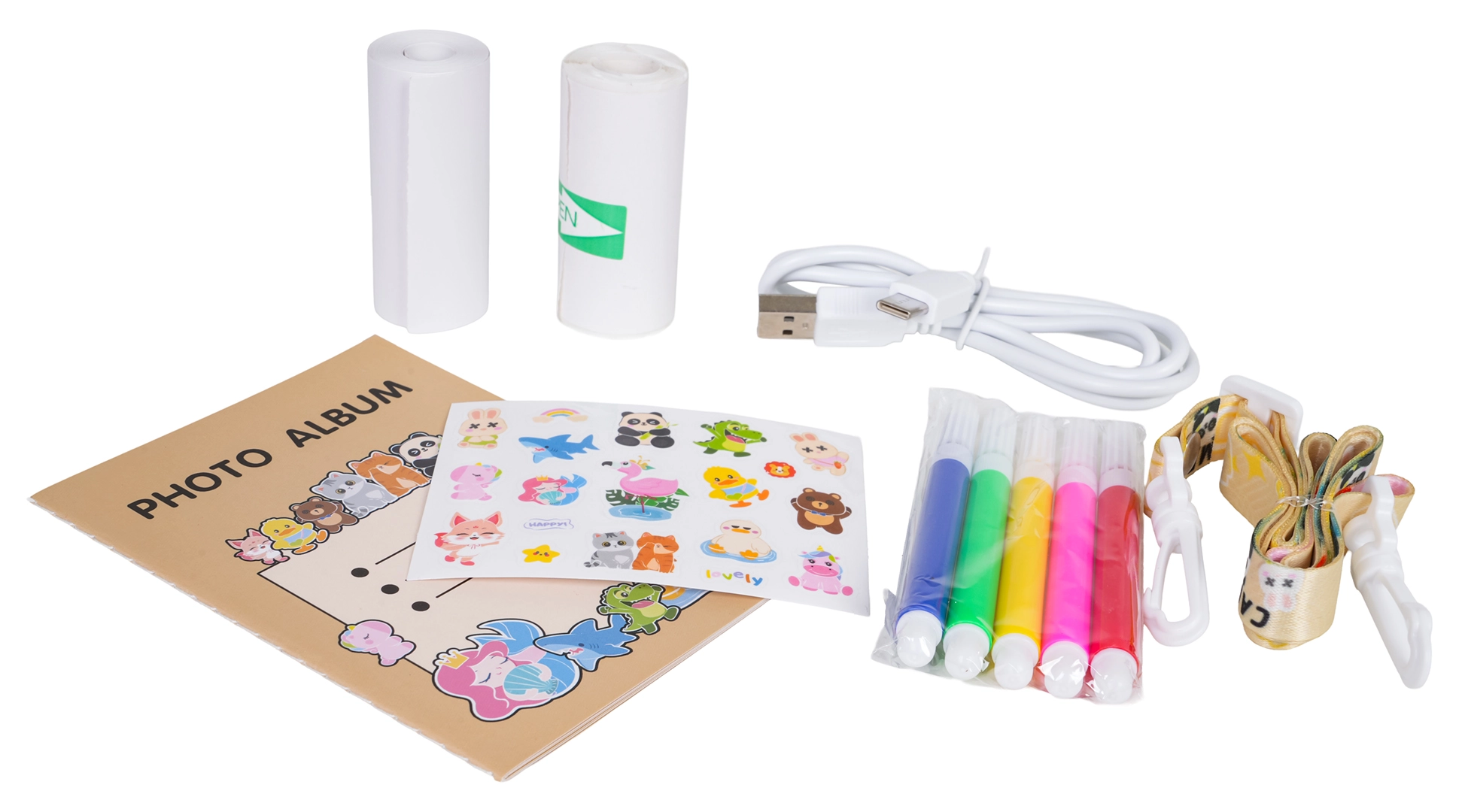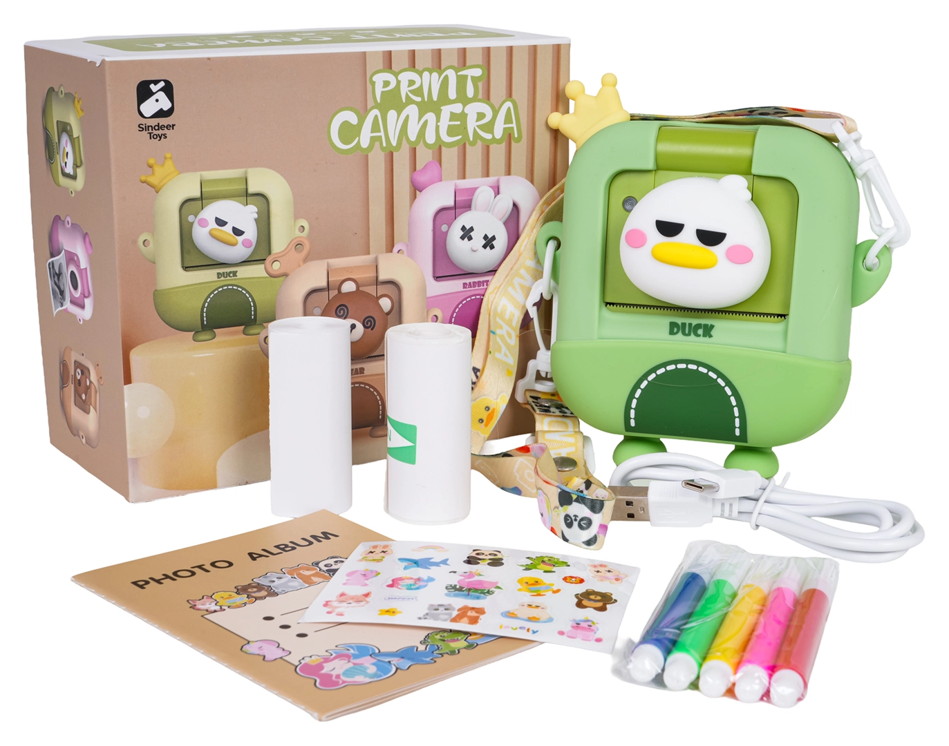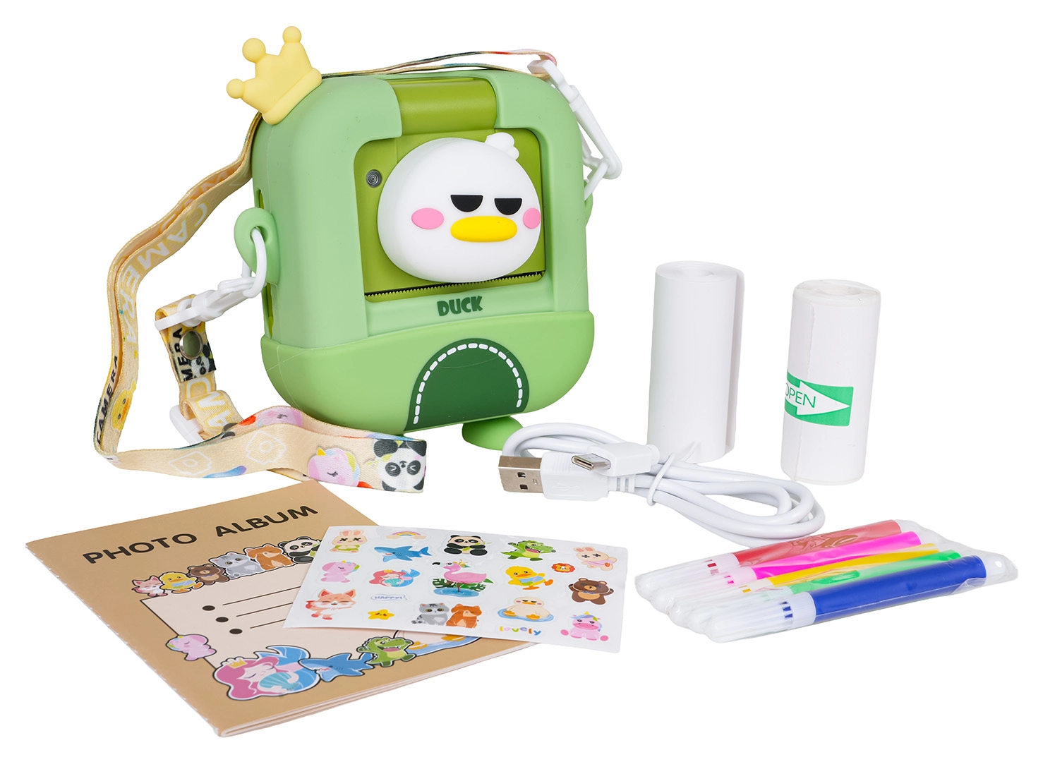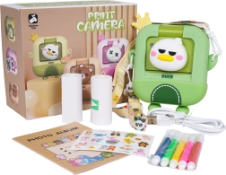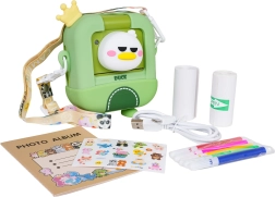 Ieprieciniet mazos fotogrāfus ar bērnu fotoaparātu, kas uzreiz pēc uzņemšanas izdrukā attēlu uz termopapīra. Komplektā ir bagātīga radošo piederumu sada: aizsargmaciņš, 2 ruļļi termopapīra, USB kabelis, siksniņa, fotoalbums, uzlīmes un krāsaini flomāsteri, ar kuru palīdzību var izkrāsot izdrukātās melnbaltās fotogrāfijas. Fotoaparāts piedāvā video ierakstīšanu, jautrus efektus un glabāšanu atmiņas kartē (kartiņas slots), tāpēc tas ir ideāls kā dāvana bērniem no 3 gadu vecuma.