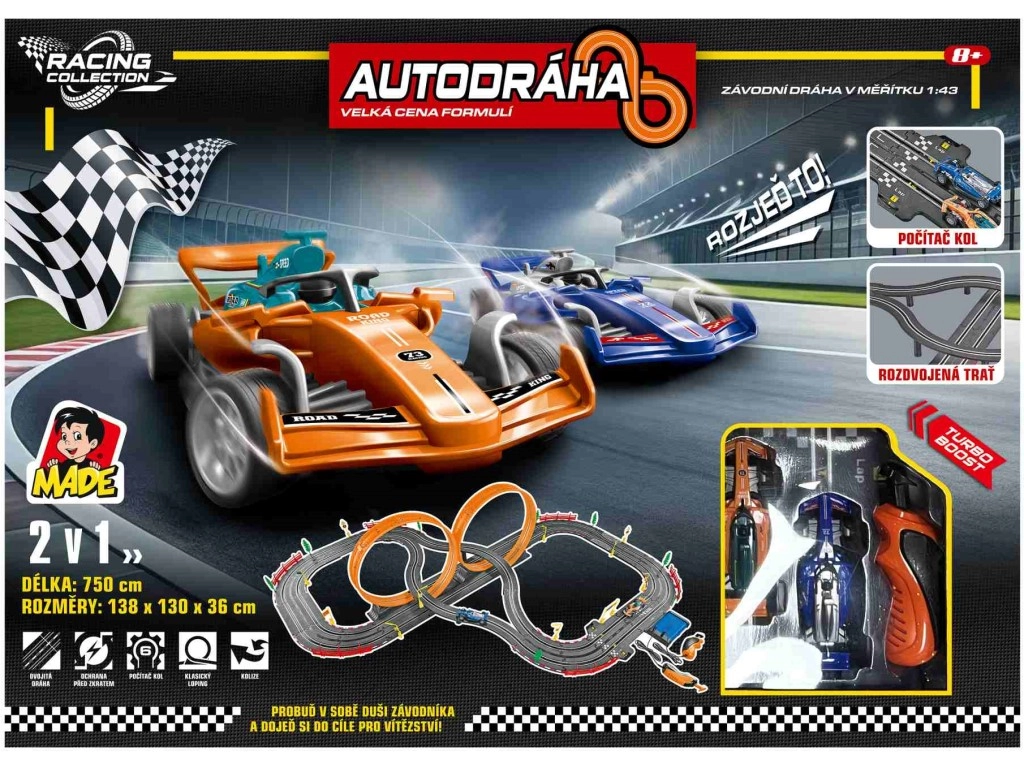 Šī autotrase ar formulām pārvērtīs viesistabu sacīkšu aplī. Pateicoties robustai konstrukcijai un pārdomātam izkārtojumam, tā piedāvā dinamiskas sacīkstes, vienkāršu vadību un tūlītēju gatavību braukšanai, jo komplektā iekļauts 12 V adapteris. Saliktās trases izmēri 138 × 130 × 36 cm nodrošina pietiekami daudz vietas dinamiskam braucienam.